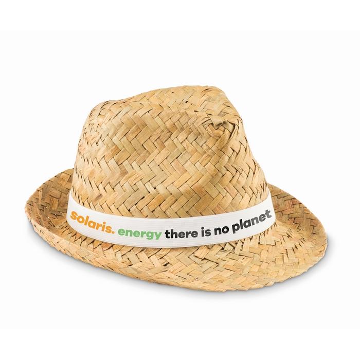 Chapeau en paille naturelle avec bandeau élastique non cousu. Pour les commandes non imprimées, le bandeau sera fourni non attaché à l'article.