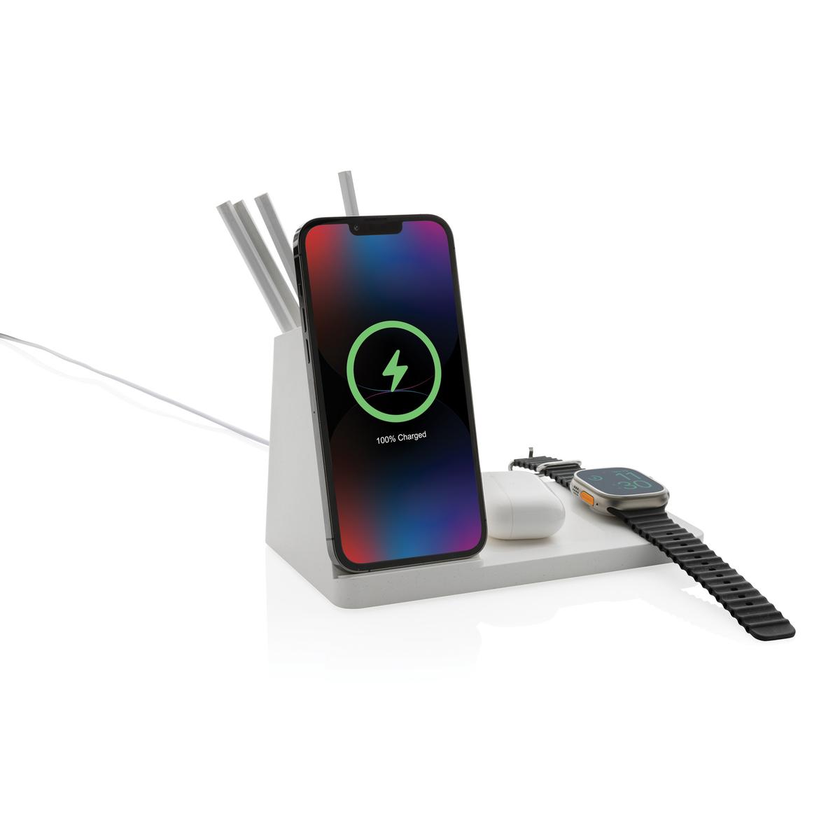 Chargeur à induction 15W avec porte-stylo en ABS recyclé certifié RCS (Recycled Claim Standard). Contenu recyclé total : 75 % sur la base du poids total de l'article. La certification RCS garantit une chaîne d'approvisionnement entièrement certifiée pour les matériaux recyclés. Zone de recharge sans fil en bambou FSC 100 %. Avec un chargeur à double bobine de 15 W et un chargeur de 5 W pour d'autres articles rechargeables sans fil comme les écouteurs et un chargeur de montre de 2,5 W. Un port USB A et un port USB C à l'arrière pour le chargement par câble. Chargement sans fil compatible avec les dernières générations d'Android et l'iPhone 8 et plus. L'article et les accessoires sont exempts de PVC. Câble de charge de type C de 120 cm inclus, fabriqué en TPE recyclé certifié RCS. Emballé dans une boîte kraft FSC mix. 9V/3A ; W : 9V/1.1A ; 9V/1.67 A/(15W), Oreillettes : 5V/1A (5W), Montre : 5V/0,5A (2,5W), sortie USB/Type-C : 5V / 2,1A . Modèle déposé®