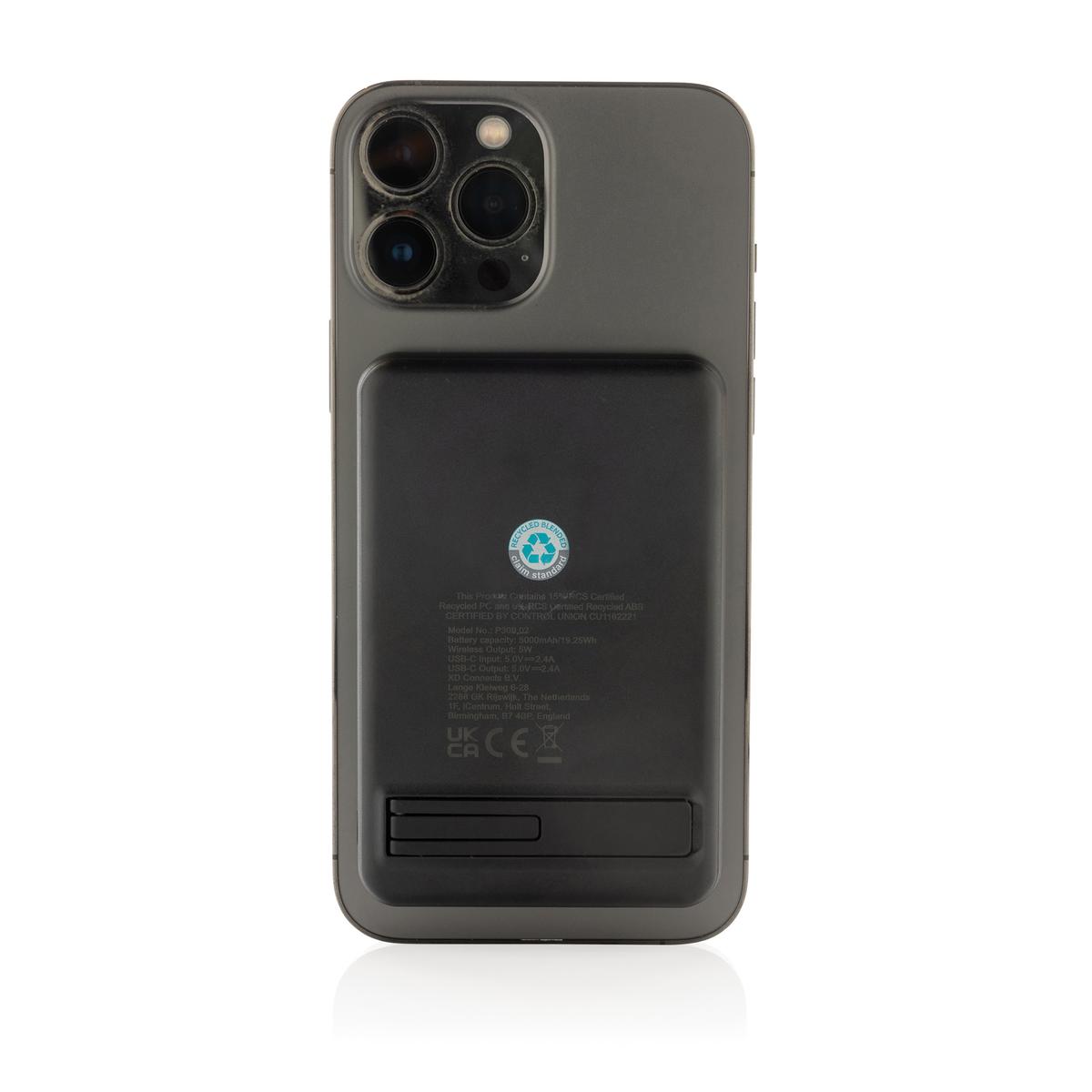 Chargeur sans fil 3-en-1 avec socle de recharge fabriqué en ABS et PC recyclé RCS. Lorsque vous devez vous rendre quelque part, il vous suffit de retirer le powerbank magnétique de la station d'accueil et de l'accrocher à votre téléphone. Contenu recyclé total : 59 % sur la base du poids total de l'article. La certification RCS garantit une chaîne d'approvisionnement entièrement certifiée pour les matériaux recyclés. Le chargeur sans fil est équipé d'un chargeur sans fil magnétique de 5 W et d'un chargeur sans fil supplémentaire de 5 W adapté aux boîtiers d'écouteurs ou à d'autres petits appareils rechargeables sans fil, ainsi que d'un chargeur sans fil de 2,5 W pour les smartwatches (montres Apple uniquement). Câble TPE recyclé de 120 cm certifié RCS inclus. Emballé dans un emballage FSC® mix. Article et accessoires 100% sans PVC. Entrée : 5V/2,4A pour une utilisation optimale. Sortie : Téléphone : 5V/1A, Ecouteurs : 5V/1A, Montre : 5V/0.5A. Sans PVC.
