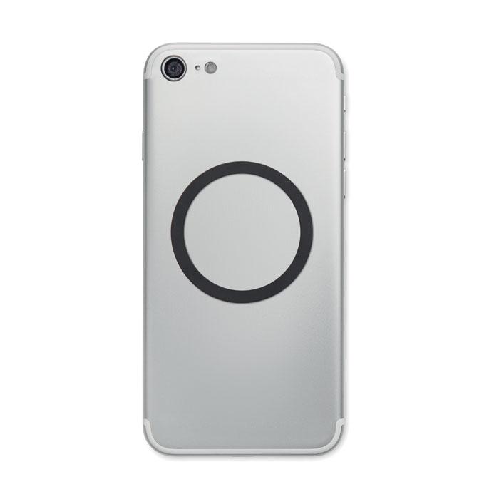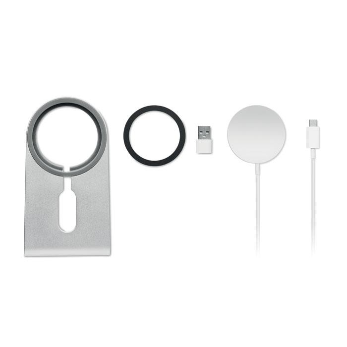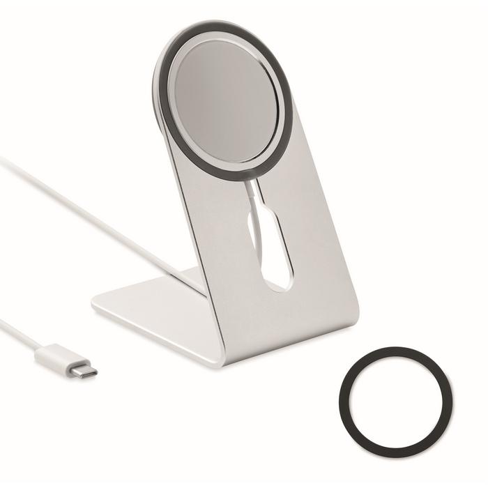Chargeur sans fil magnétique portable en aluminium de 15W avec support pour téléphone. Comprend un anneau métallique magnétique supplémentaire . Sortie : 9V/1.67A (15W) pour une charge rapide. Compatible derniers Androïdes, iPhone® 12 et plus récents.