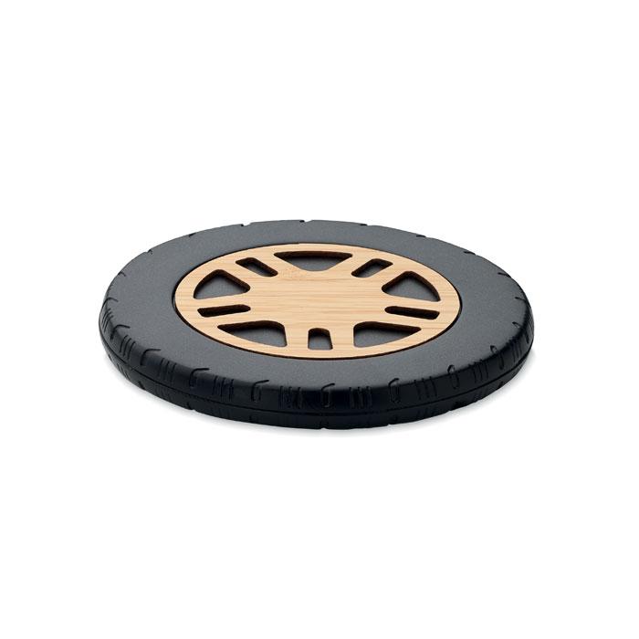 Chargeur sans fil 15W en ABS recyclé et dessus en bambou. Design de roue de voiture. Sortie : DC 9V/1.10A (15W) pour une charge rapide. Compatible avec les derniers androïdes, iPhone® 12, X et plus récents.
