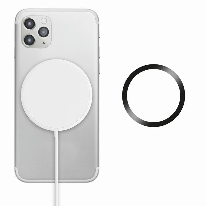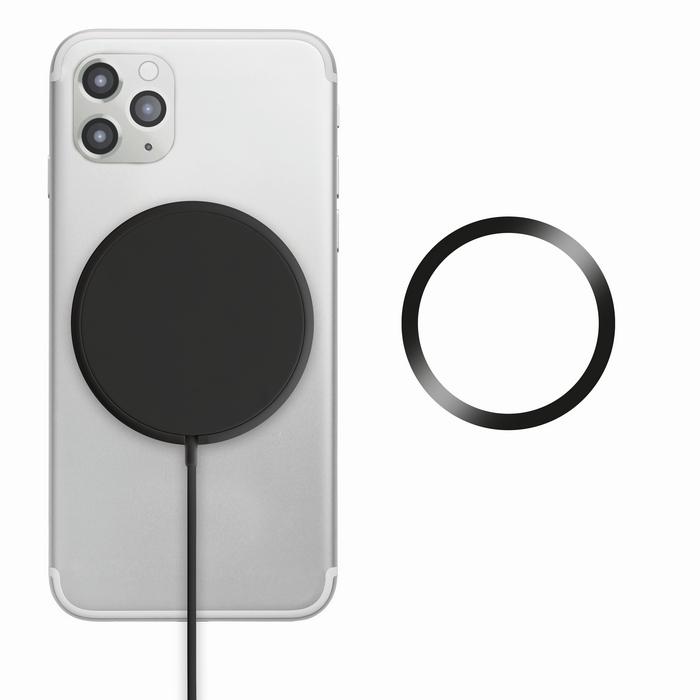 Chargeur sans fil magnétique en ABS. Sortie : DC 9V/1.1A (10W) pour une charge rapide. Compatible avec l'iPhone® 12 et plus récent. Comprend un anneau métallique magnétique supplémentaire pour prendre en charge la charge d'autres téléphones non magnétiques rechargeables sans fil.
