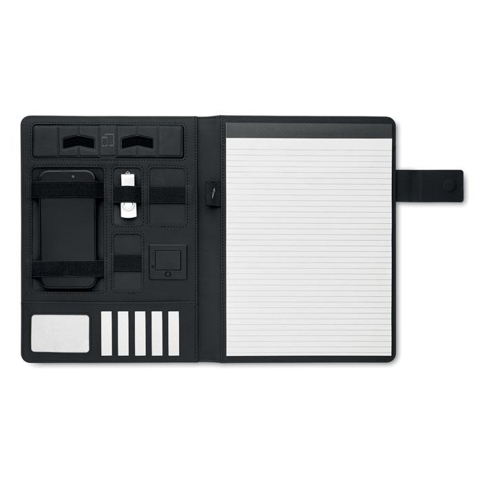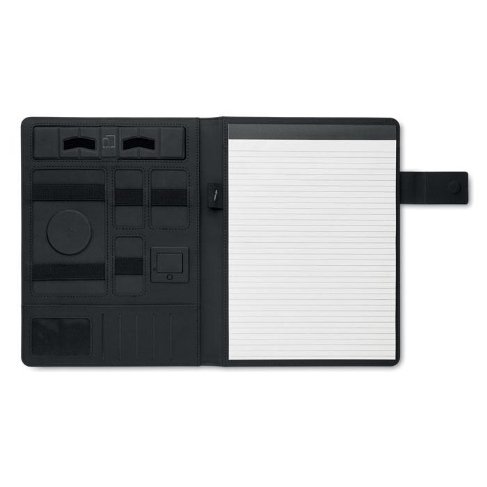 Conférencier A4 avec couverture en polyuréthane. Power bank de 5000 mAh et chargeur magnétique sans fil de 15W. bloc-notes de 20 feuilles lignées. Plusieurs compartiments internes. Fermeture magnétique. Porte-stylo élastique.