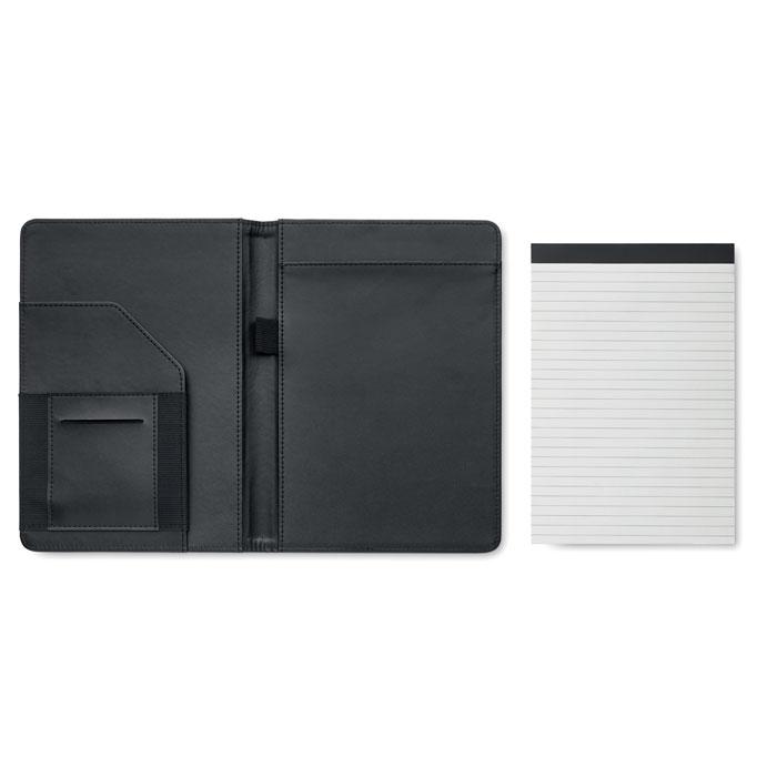 Conférencier A5 en 300D RPET 2 tons. Bloc-notes A5 remplaçable. 40 pages blanches lignées en papier bambou (20 feuilles). Porte-stylo. Porte-cartes à l'intérieur et un grand compartiment.