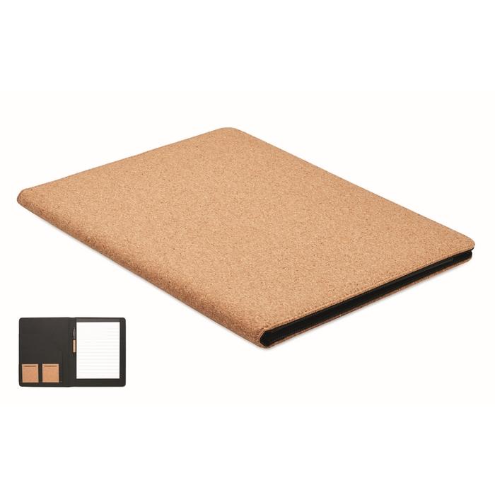 Conférencier A4 en liège. Bloc-notes A4 rechargeable. 30 feuilles lignées en papier recyclé. Stylo et porte-stylo assortis. 2 porte-cartes et un grand compartiment.