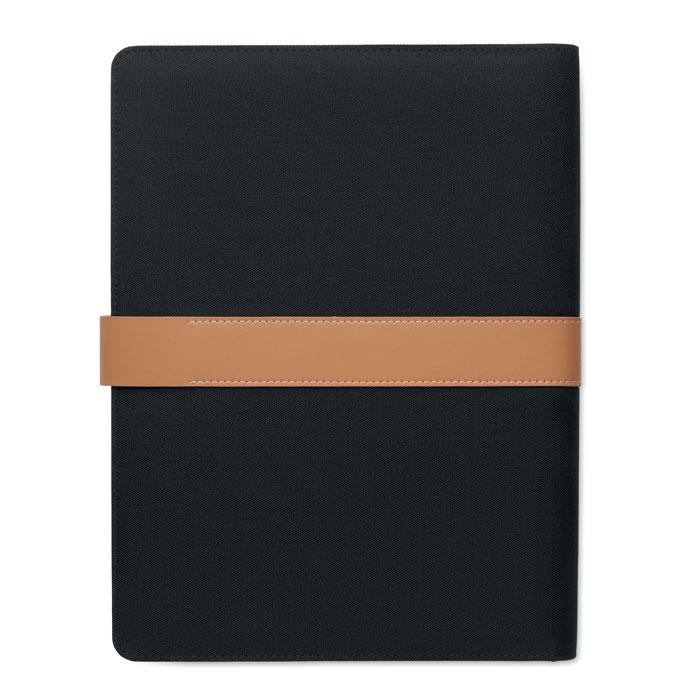 Conférencier A4 en RPET avec détails en similicuir. Bloc-notes A4 remplaçable de 30 pages lignées en papier recyclé. Porte-stylo. 4 porte-cartes, 3 petites poches et un grand compartiment. Fermeture magnétique.