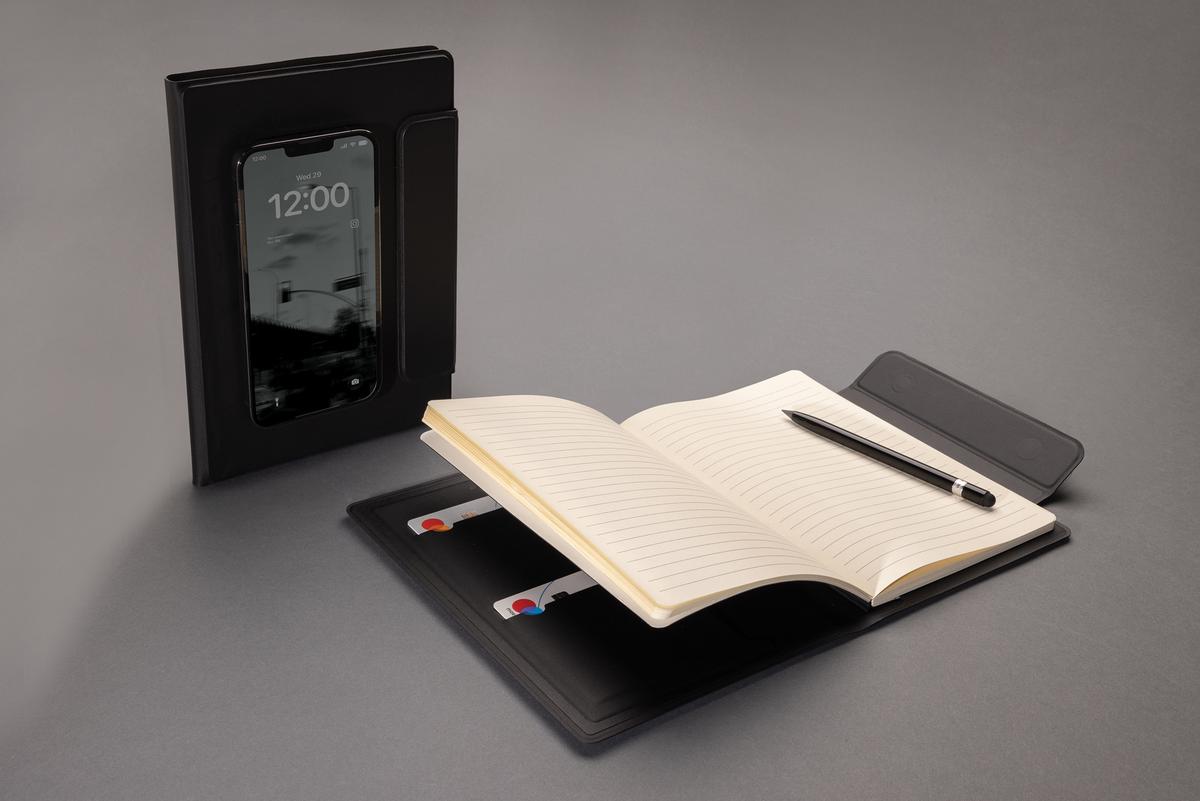 Porte-documents A5 en polyester recyclé RCS avec fermeture magnétique et porte-téléphone magnétique compatible avec les iPhones 12 Magsafe ou supérieurs, carnet de notes A5 avec lignes, pages intérieures certifiées FSC® et 64 feuilles/128 pages ; couleur de papier crème avec lignes ; poids de papier 80gsm, poche pour documents et 2 fentes pour cartes de visite. Le carnet est rechargeable.