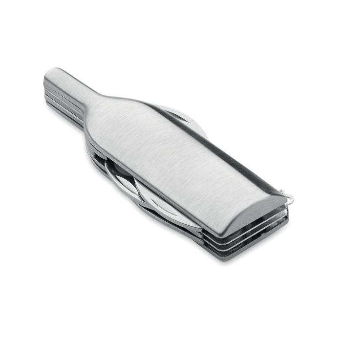 Couteau de poche en acier inoxydable en forme de bouteille de vin avec 4 fonctions : décapsuleur, couteau, tire-bouchon et porte-clés.