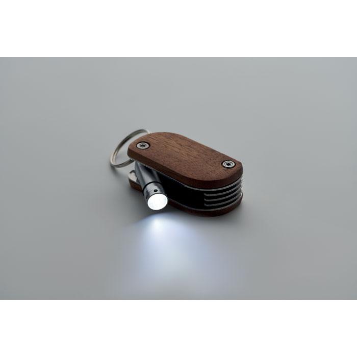 Couteau de poche multi-outils en acier inoxydable avec manche en bois d'acacia. 7 fonctions : décapsuleur, couteau, ouvre-boîte, lime, tournevis, porte-clés et 1 lampe LED. 3 piles bouton incluses.