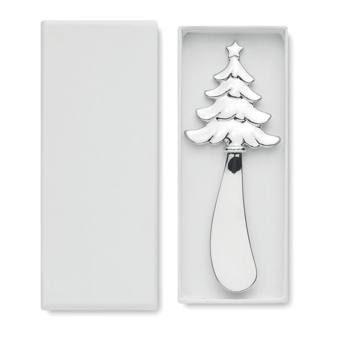 Couteau & fromage en alliage de zinc en forme de sapin de Noël. Présenté dans une boîte cadeau.