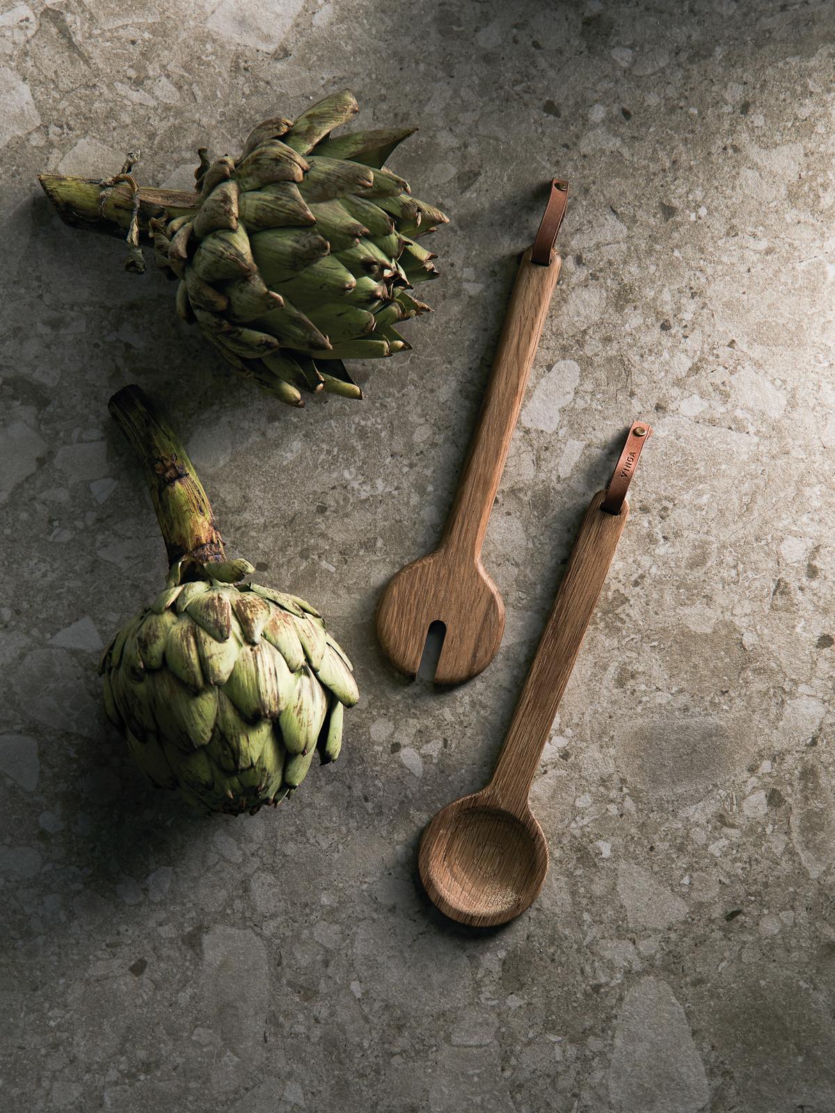 Couverts de service en chêne avec un fin détail en similicuir. Le bois magnifique apporte une touche vivante et chaleureuse au design simple et élégant. Parfait pour la vie de tous les jours et les fêtes.