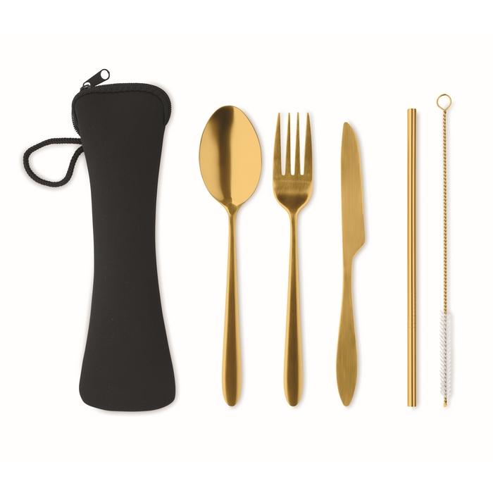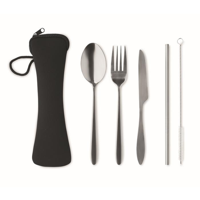 Ensemble de couverts réutilisables en acier inoxydable comprenant une fourchette, un couteau, une cuillère, une paille et un écouvillon dans une pochette en néoprène.