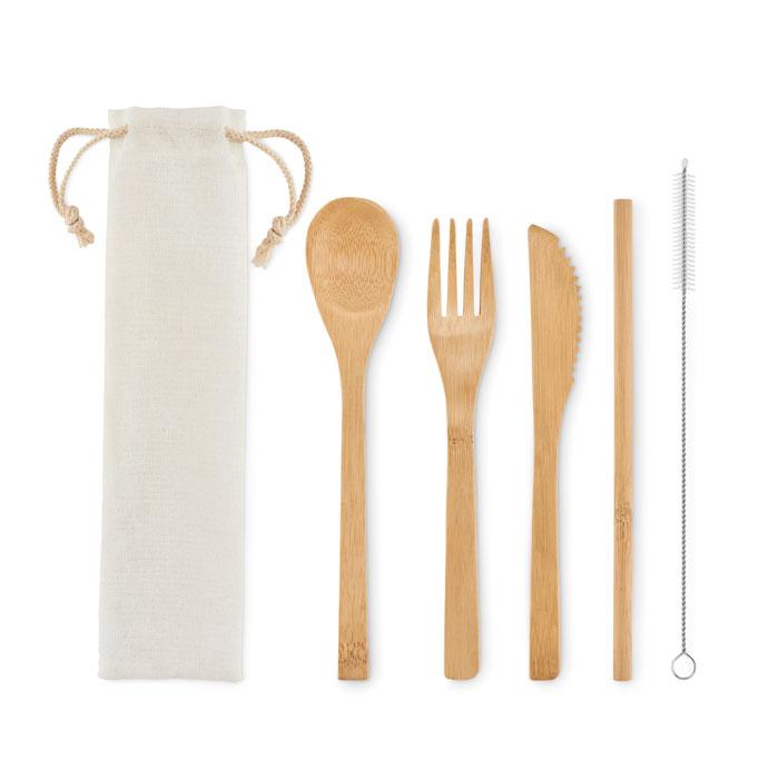 Ensemble de couverts en bambou réutilisables dans une pochette en toile. Comprend un couteau, une fourchette, une cuillère, une paille en bambou et un écouvillon en acier inoxydable. Le bambou est un produit naturel, et présente de légères variations de couleur, de décoration et de tailles.