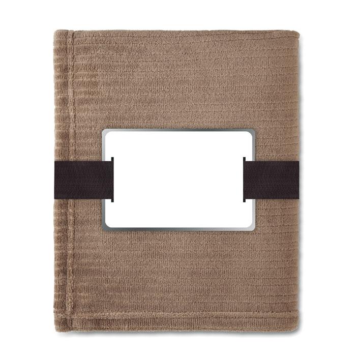 Couverture souple en polaire de 240 gr/m² enveloppée dans un ruban et carte imprimable.