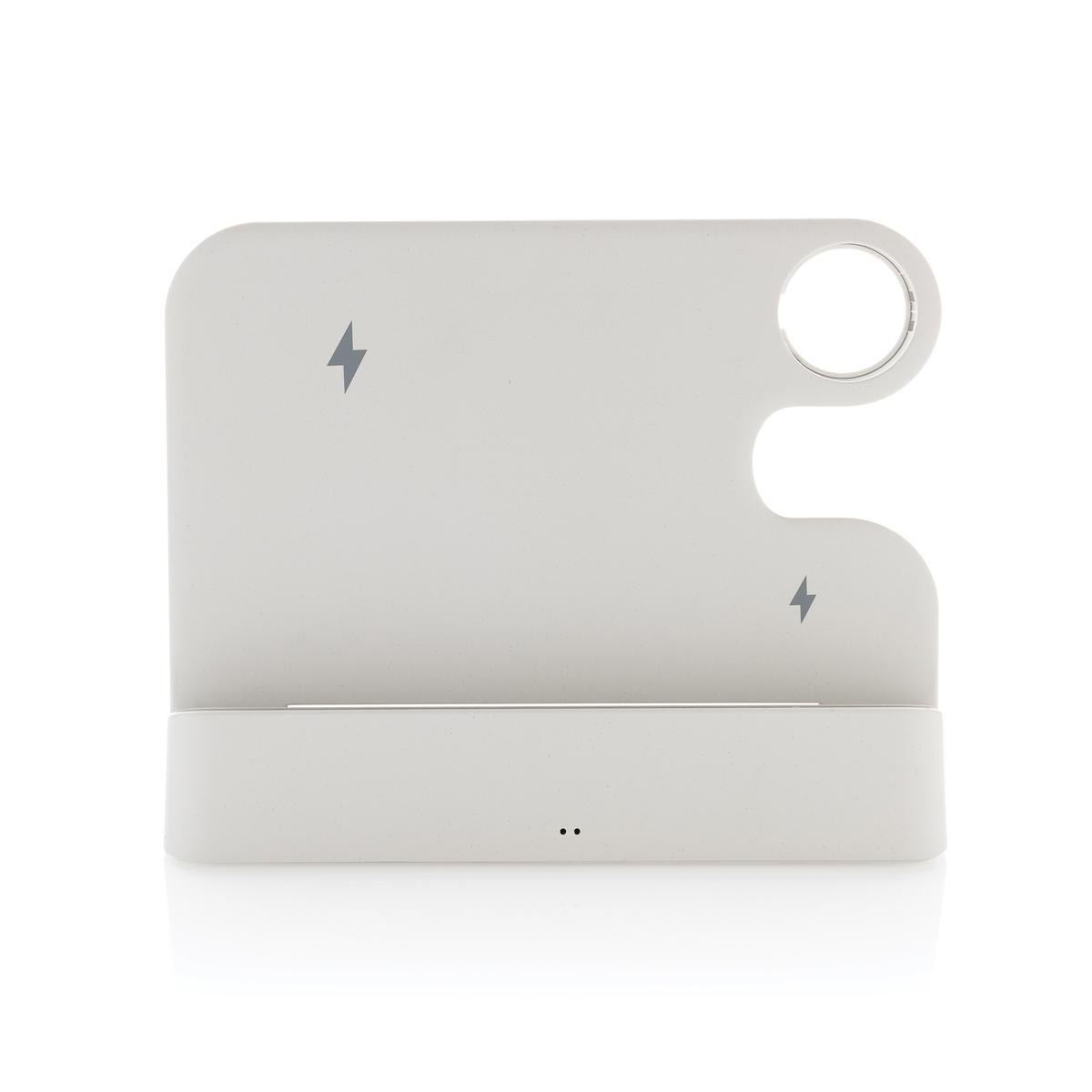 Support de chargement pliable avec chargeur sans fil 15W en ABS recyclé. Avec un deuxième chargeur sans fil de 5W pour charger des appareils plus petits comme des écouteurs. Avec emplacement iWatch pour pouvoir utiliser le câble officiel iWatch. Avec une sortie USB A et USB C 5 V/1 A à l'arrière pour charger des appareils avec un câble. Avec des embouts en silicone au bas du support pour éviter de glisser et avec rembourrage en silicone pour garder votre téléphone dans une position optimale. Contenu recyclé total : 80 % sur la base du poids total de l'article. La certification RCS garantit une chaîne d'approvisionnement entièrement certifiée pour les matériaux recyclés. La certification RCS garantit une chaîne d'approvisionnement entièrement des matériaux recyclées. Câble de charge USB A vers type C de 120 cm inclus, fabriqué en TPE recyclé certifié RCS. Sans PVC. Emballé dans un emballage FSC®.