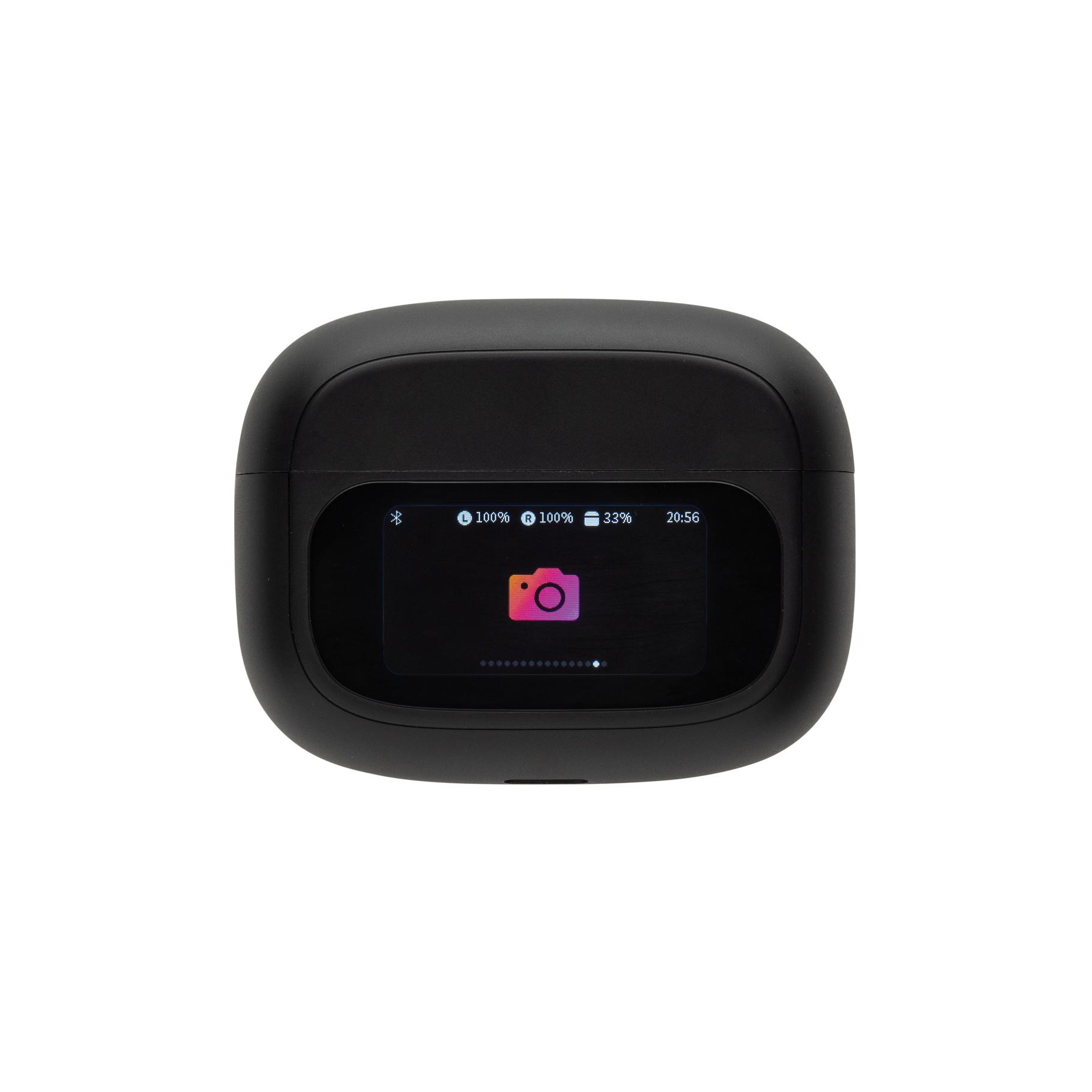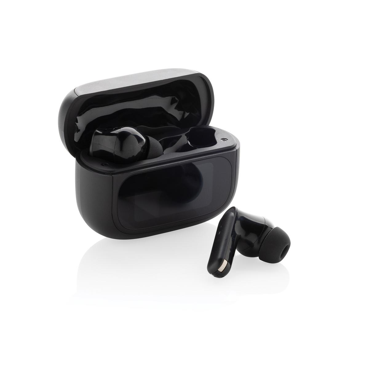 Ces écouteurs vous permettent de travailler ou de voyager en silence. La fonction ANC permet de réduire les bruits extérieurs. L'étui de chargement est doté d'un écran tactile TFT intégré qui offre de nombreuses fonctions : trouver vos écouteurs, régler le volume, sélectionner la chanson suivante, répondre aux appels. Les écouteurs et l'étui de chargement sont fabriqués en ABS recyclé certifié RCS (Recycled Claim Standard). Contenu recyclé total : 43 % sur la base du poids total de l'article. La certification RCS garantit une chaîne d'approvisionnement entièrement certifiée pour les matériaux recyclés. Les écouteurs utilisent la technologie BT 5.3 pour un appairage facile et une connexion stable, avec une batterie de 30 mAh qui permet une autonomie de 6 heures (avec ANC) et peuvent être rechargés en 1,5 heure dans l'étui de chargement. Degré ANC : 23 DB. Trois tailles d'embouts sont incluses. Étanchéité IPX 4. Avec micro ENC pour des appels clairs. Emballé dans une boîte kraft FSC.