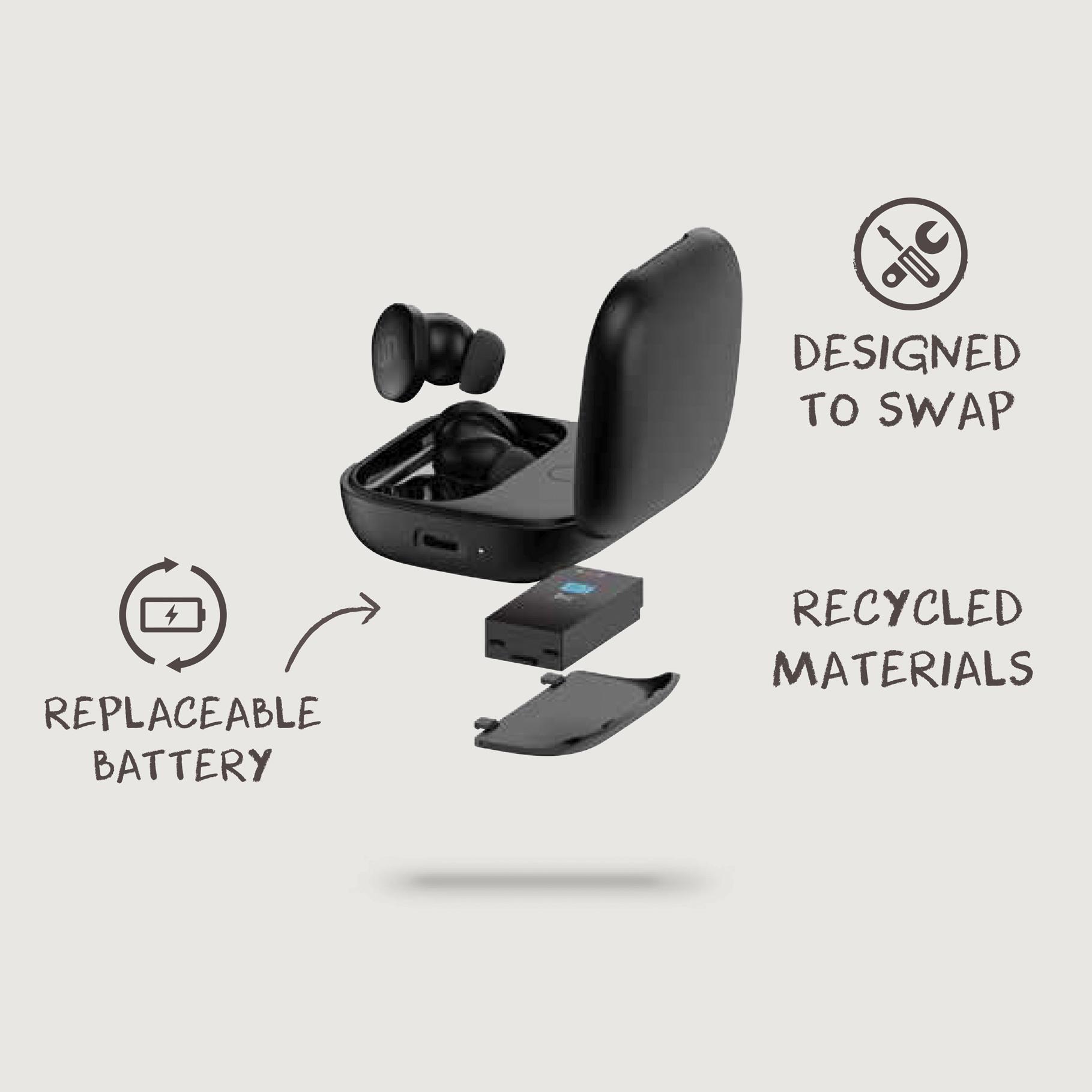 Rencontrez le futur. Un avenir où les objets sont faits pour durer plus longtemps et conçus de manière à pouvoir être réparés facilement. Les écouteurs Lakewood offrent une qualité sonore haut de gamme. Avec une superbe qualité ANC (32 DB) et un mode ENC pour avoir des appels clairs. Avec 6 microphones et d'une assistance vocale pour améliorer encore plus la qualité des appels. La fonction ANC peut également être désactivée. Dans le boîtier se trouve une batterie amovible qui peut être facilement remplacée si vous souhaitez rallonger la durée de vie des écouteurs. Durée d'autonomie de 6 heures avec un seule charge et 20 heures supplémentaires par boîtier? Les écouteurs sont IPX5 donc résistants aux intempéries et adaptés au sport. Les écouteurs sont fabriqués en plastique PC recyclée. Contenu recyclé total: 36 % sur la base du poids total de l'article. La certification RCS garantit une chaîne d'approvisionnement entièrement certifiée pour les matériaux recyclés. Sans PVC.