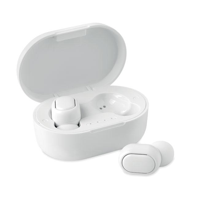 Oreillettes stéréo sans fil (TWS) 5.0 en ABS recyclé avec microphone et batterie 40 mAh intégrée. Durée d'écoute d'environ 4 heures. Appairage automatique. Câble de charge micro USB et station de charge 300 mAh inclus.