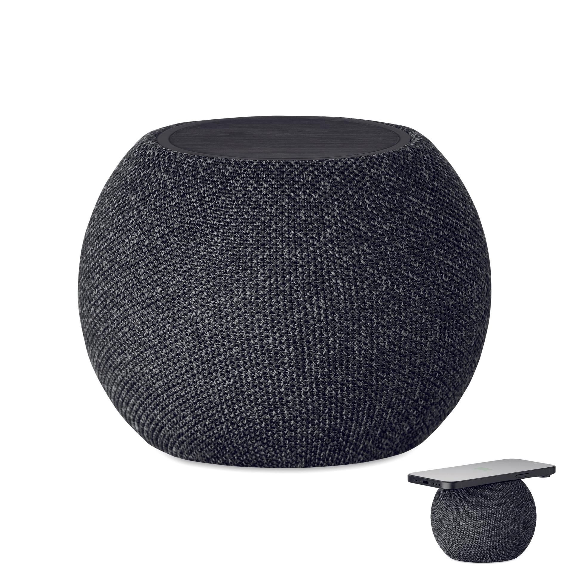 Haut-parleur 5.0 sans fil 0 et charge sans fil 15W en ABS et tissu RPET avec détails en bambou noir. 1 Batterie rechargeable Li-ION 1200 mAh incluse. Comprend un port pour carte S...