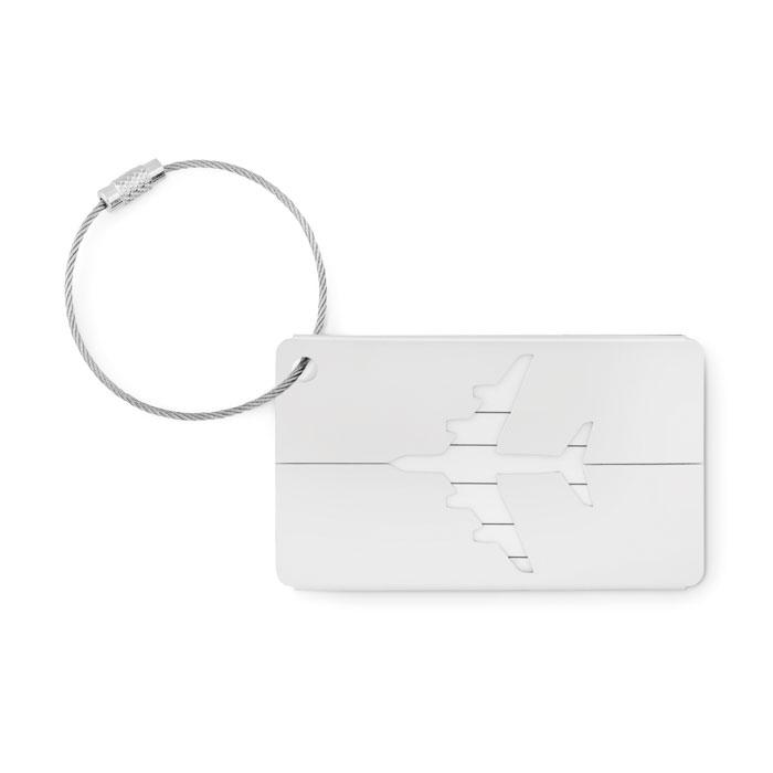 Etiquette à bagage en aluminium avec décor avion. Etiquette nom et adresse incluse. Livré avec cordon à vis.
