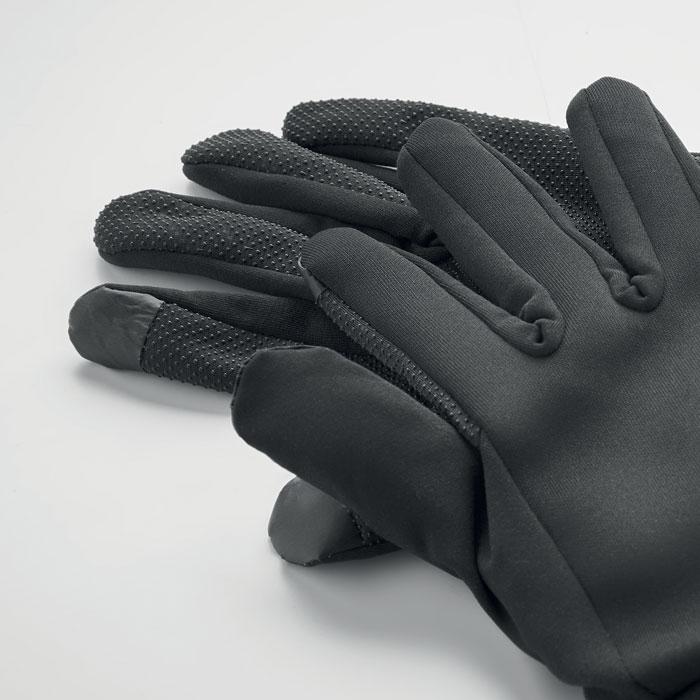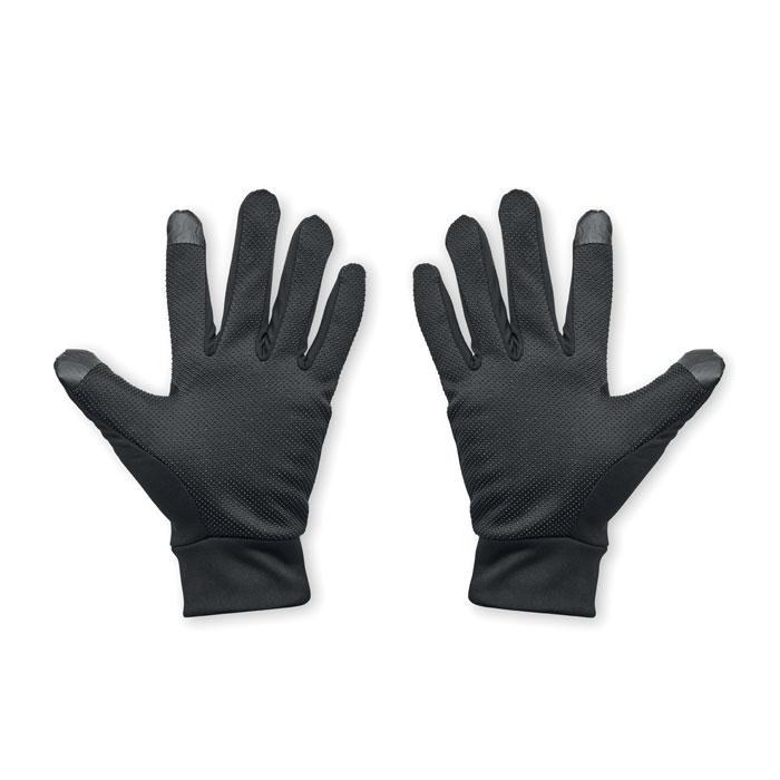 Gants de sport tactiles en polyester pour smartphone. Doigts en PVC dont deux avec fonction tactile et points antidérapants sur la paume.