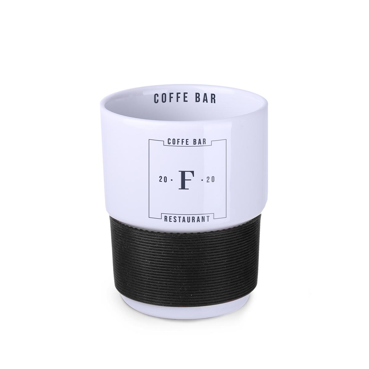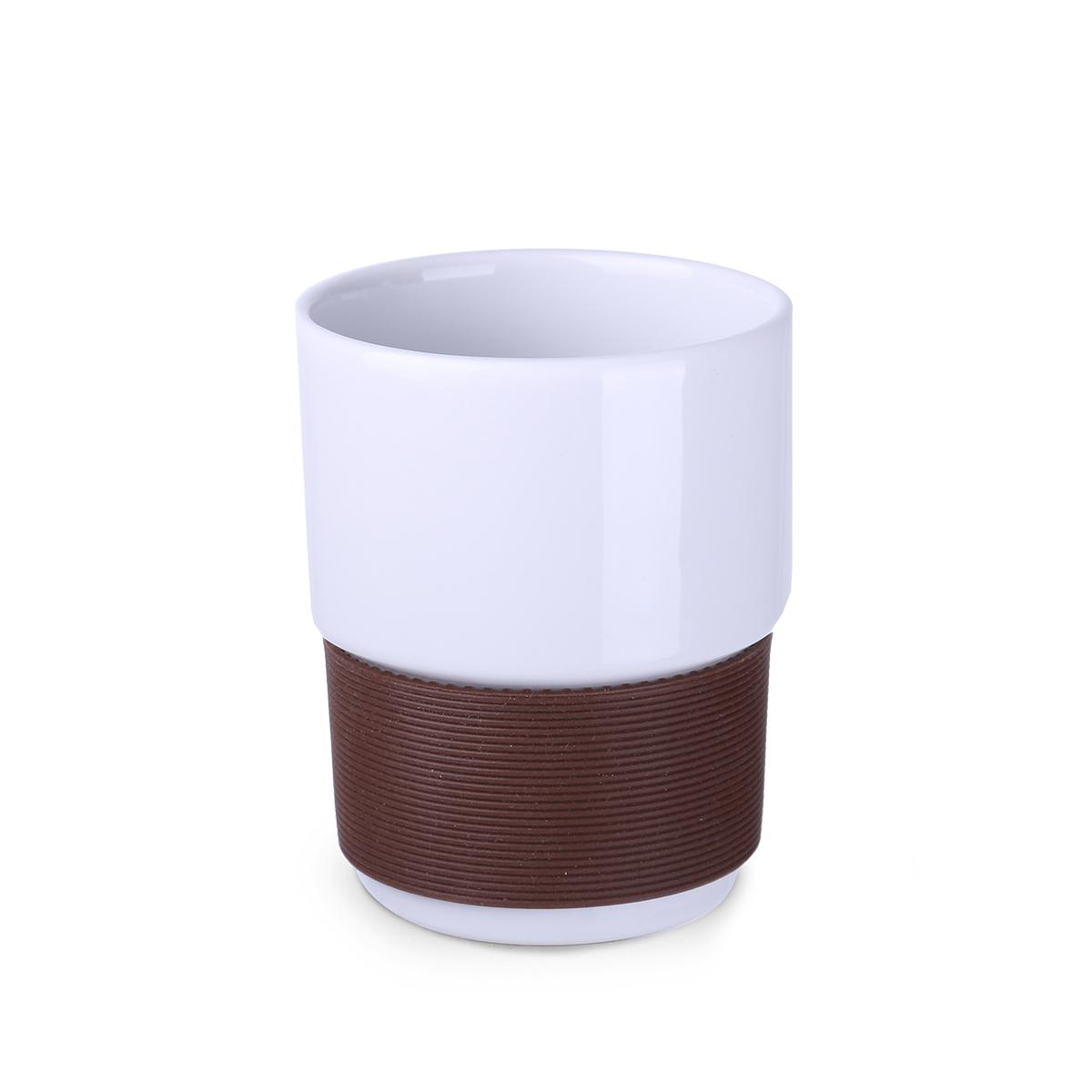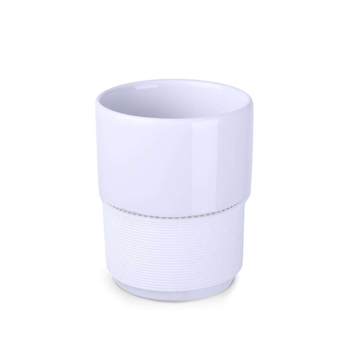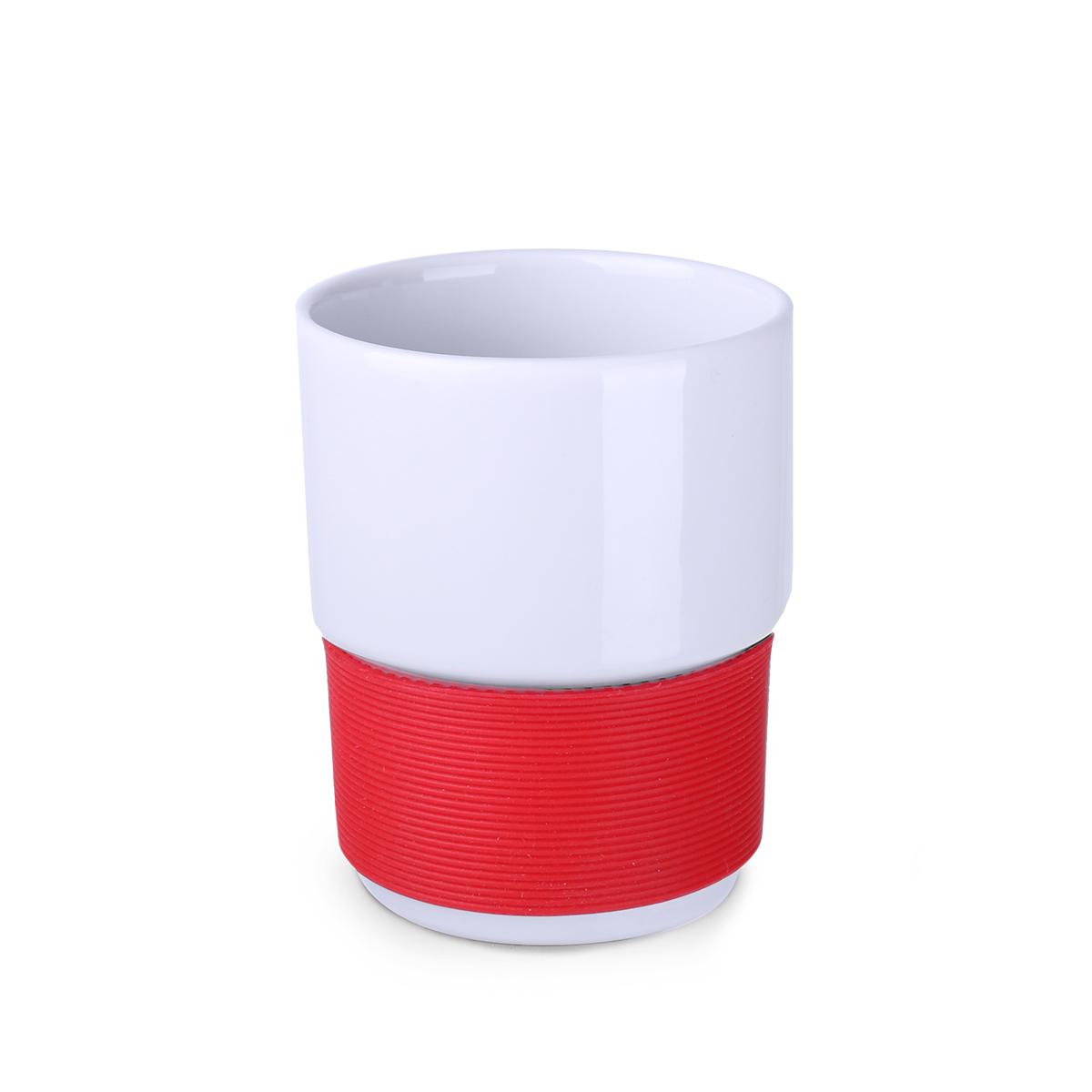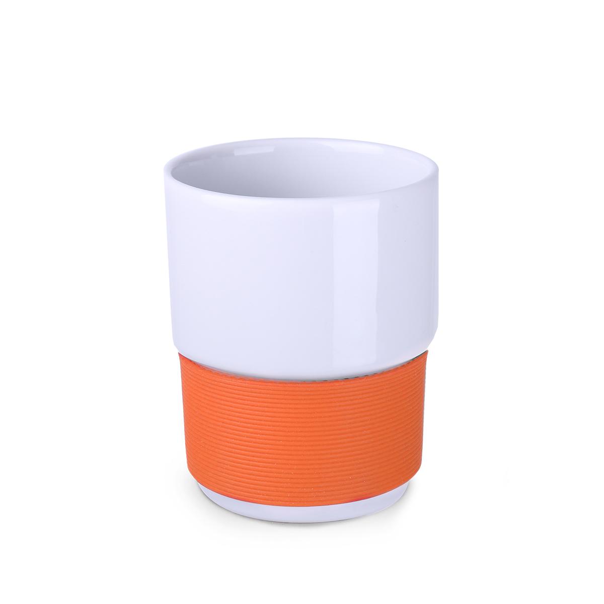 Mug330 ml en céramique blanche sans anse. Bandes silicone de 40 mm de large disponibles en 7 couleurs : blanc, orange, rouge, vert, bleu marine, marron et noir.