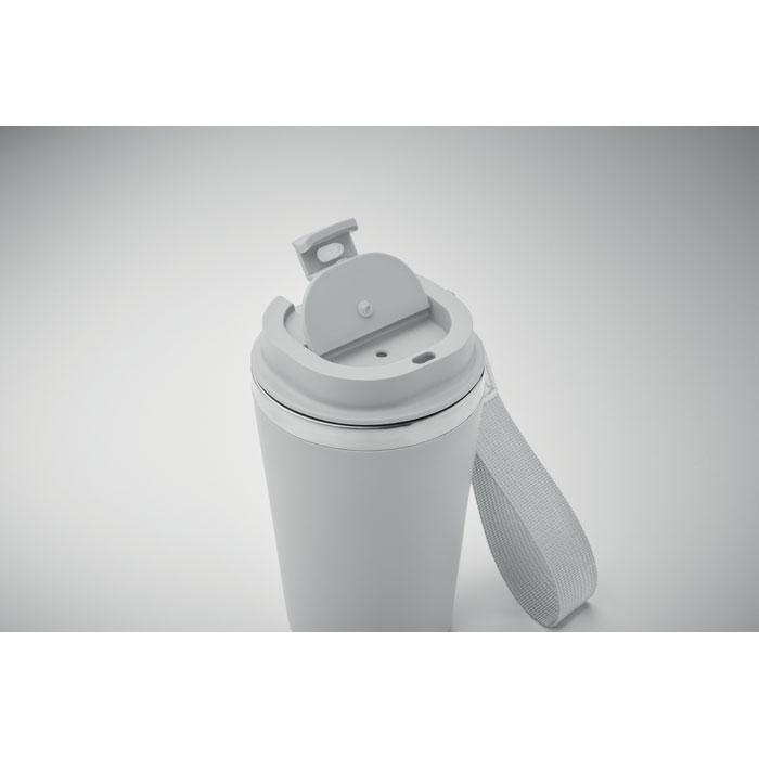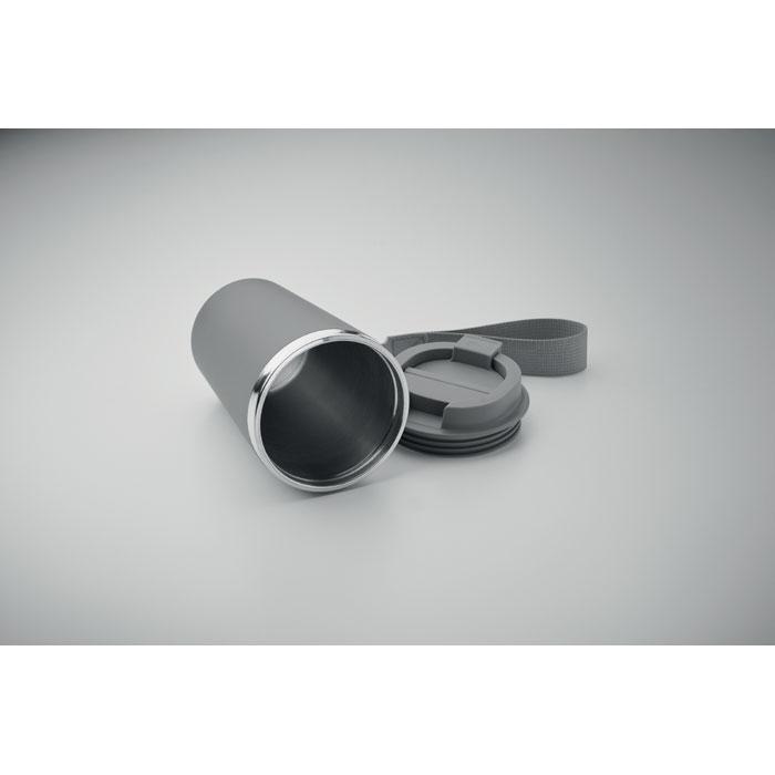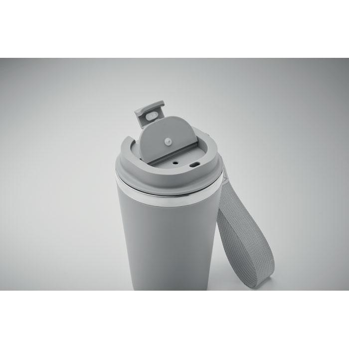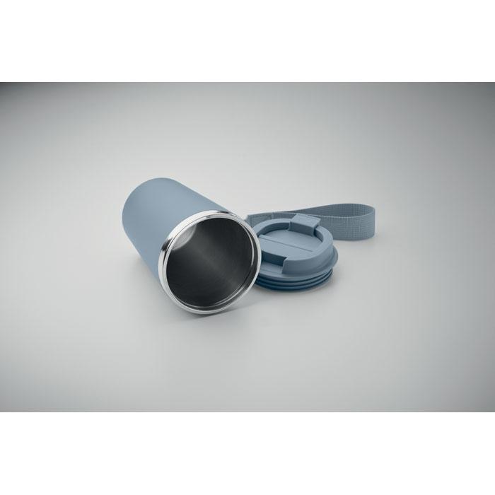 Gobelet à double paroi en acier inoxydable recyclé (90 % d'acier inoxydable recyclé et 10 % d'acier inoxydable) avec couche extérieure en PP et bracelet en RPET. Capacité : 350 ml.