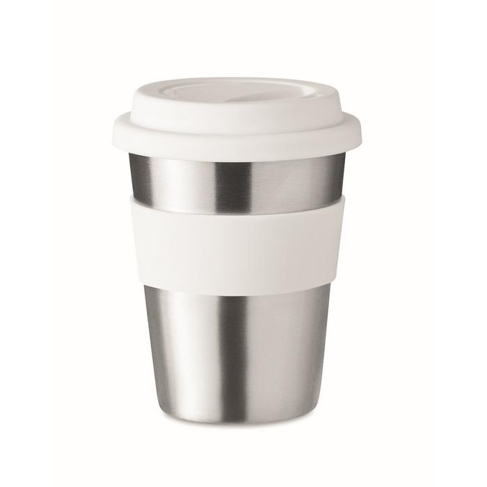 Gobelet à paroi simple en acier inoxydable avec couvercle et poignée en silicone. Capacité de 350 ml. Comme il s'agit d'un gobelet à paroi simple, un transfert de chaleur peut encore se produire.