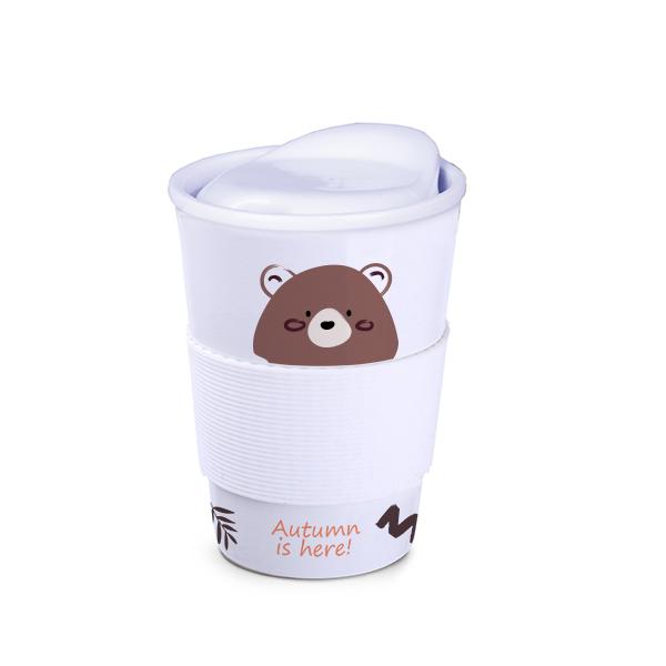 Gobelet 350 ml en céramique blanche avec un couvercle et une bande silicone. Fabriqué en Europe.