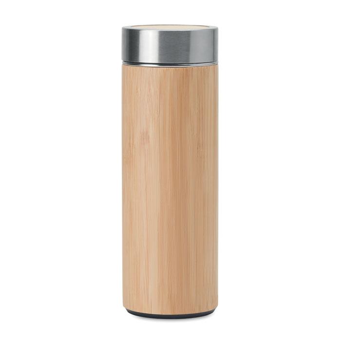 Gourde double paroi Inox avec couvercle isolant en bambou et infuseur à thé. Contenance 400 ml. Le bambou est un produit naturel, et présente de légères variations de couleur, de décoration et de tailles.
