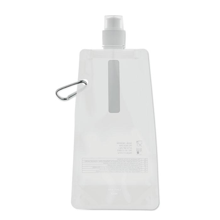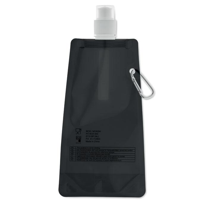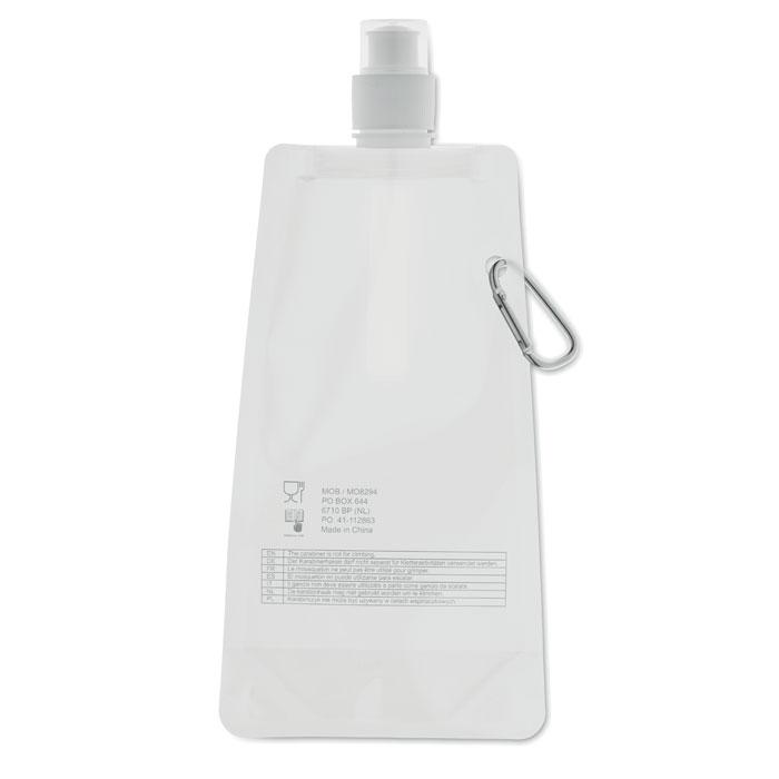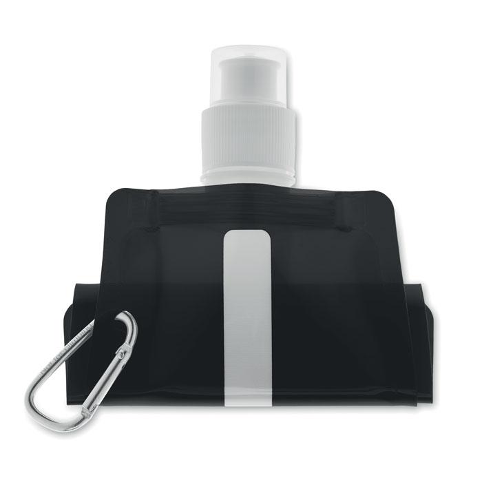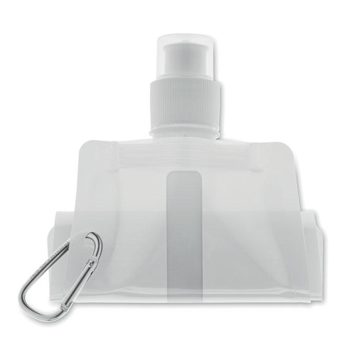 Gourde pliable en PET sans BPA, avec mousqueton en aluminium. Contenance 480 ml. Anti fuite.