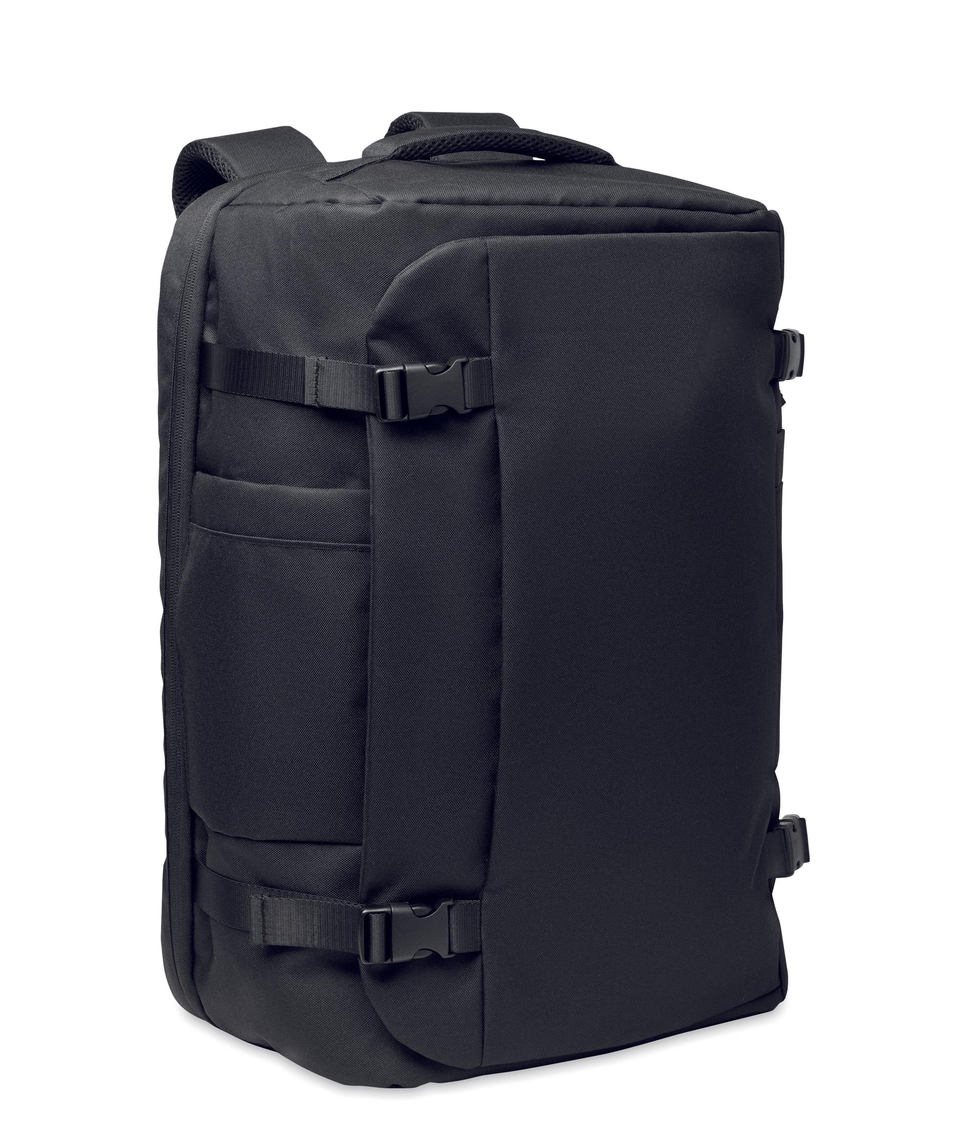 Grand sac à dos de voyage pour ordinateur portable 17 '' en polyester 600D RPET. Plusieurs compartiments : compartiment principal pour les vêtements, 2 compartiments matelassés pour l'ordinateur portable et tablette. Panneau arrière renforcé, bandoulière, poignée.