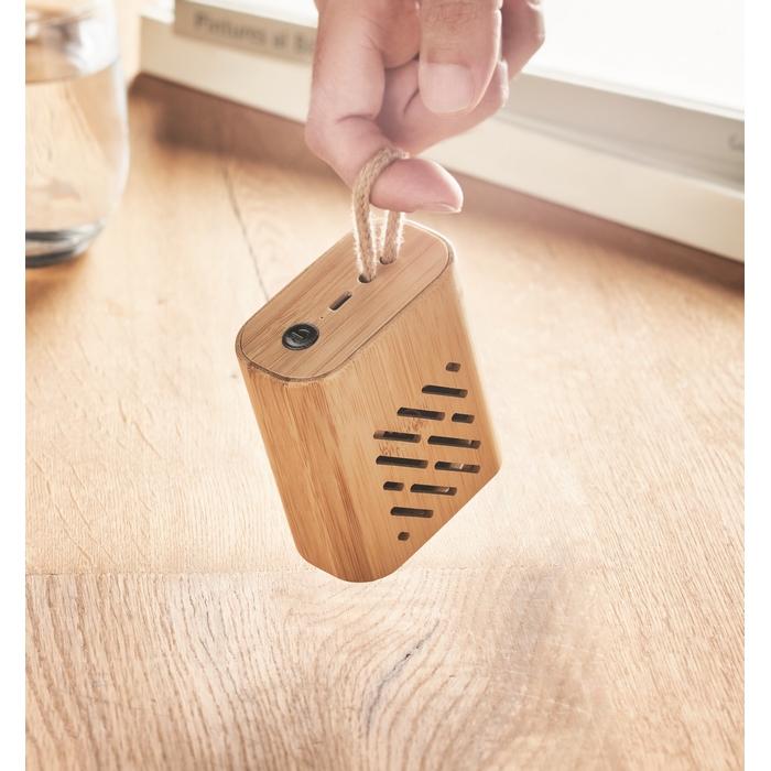Haut-parleur sans fil 5.0 avec boîtier en bambou avec témoin LED. 1 Batterie rechargeable Li-Pol 300 mAh incluse. Données de sortie : 3W, 3 Ohm et 5V. Durée d'écoute d'env. 4h (volume à 70%). Type C. Le bambou est un produit naturel, et présente de légères variations de couleur, de décoration et de tailles.