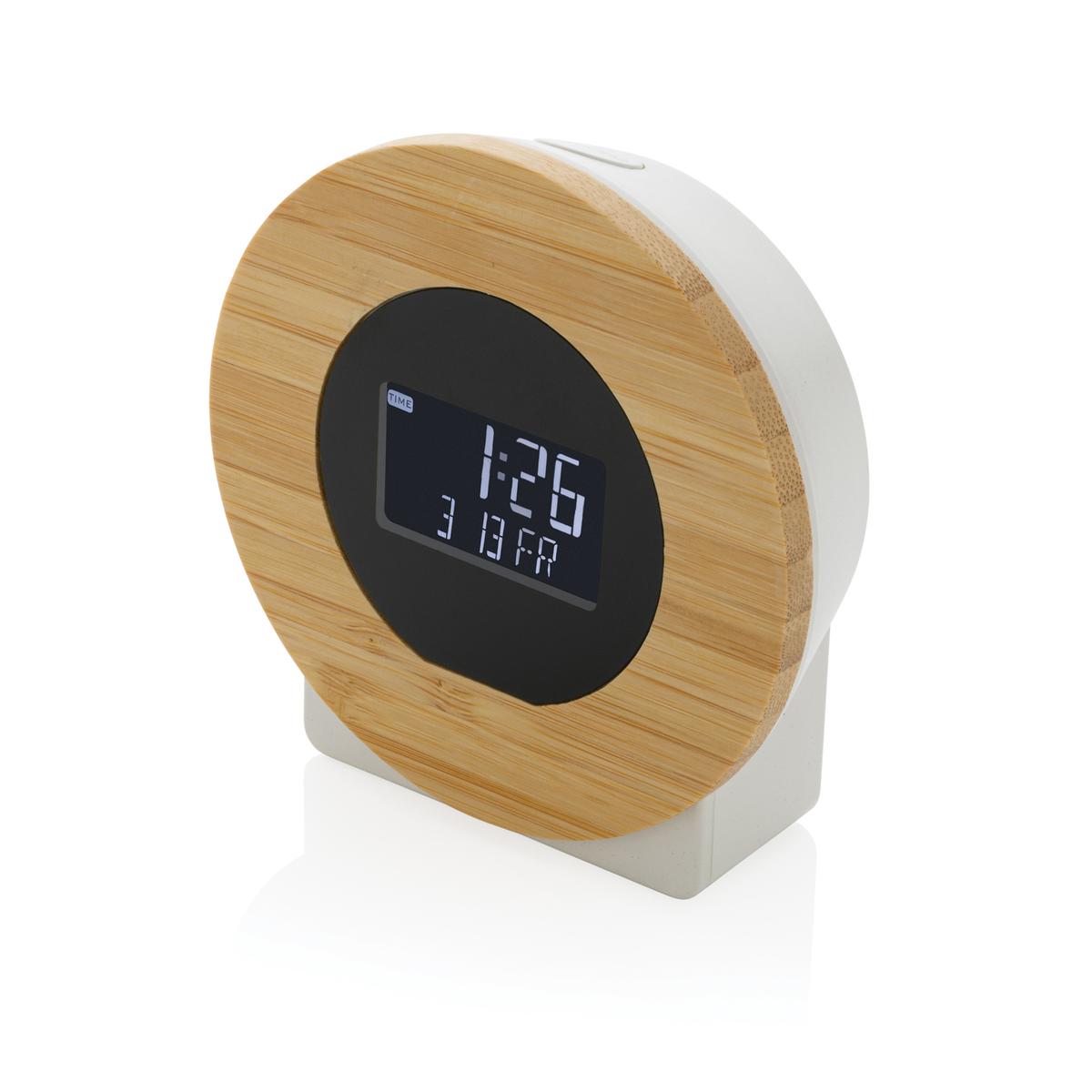Horloge de bureau fabriquée en ABS recyclé certifié RCS et bambou FSC® 100%. Teneur totale en matières recyclées: 66% selon le poids total de l'article. La certification RCS garantit une chaîne d'approvisionnement entièrement des matériaux reyclées. Ecran LCD avec fonctions heure et réveil. Contient un câble de type C fabriqué à partir de TPE recyclé certifié RCS. Emballée dans une boîte kraft FSC® mix.