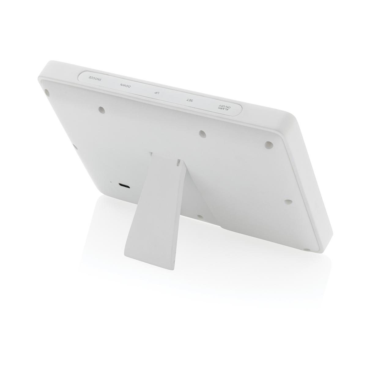 Grande horloge en ABS recyclé certifié RCS et FSC® 100% bambou. Teneur totale de matières recyclées : 76% en fonction du poids total de l'article. Le certification RCS garantît une chaîne d'approvisionnement entièrement certifiée des matérieaus recyclés. Ecran LED de haute qualité. Différentes fonctions : horloge, alarme, calendrier, température. Option de 12/24 heures, Fahrenheit/Celsius et enregistrement d'humidité. Contient un câble de 100cm de type C fabriqué à partir de TPE recyclé certifié RCS. Emballée dans une boîte kraft FSC® mix.