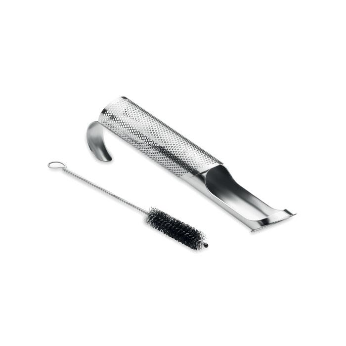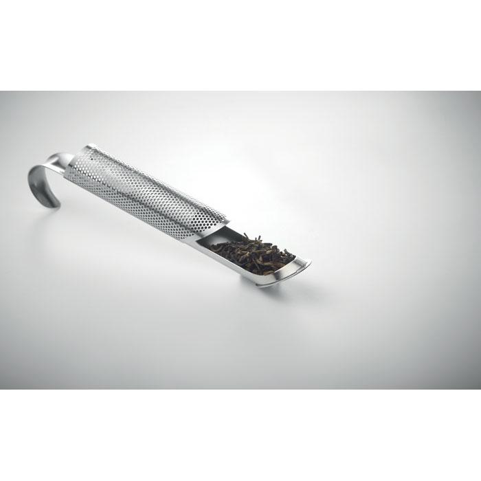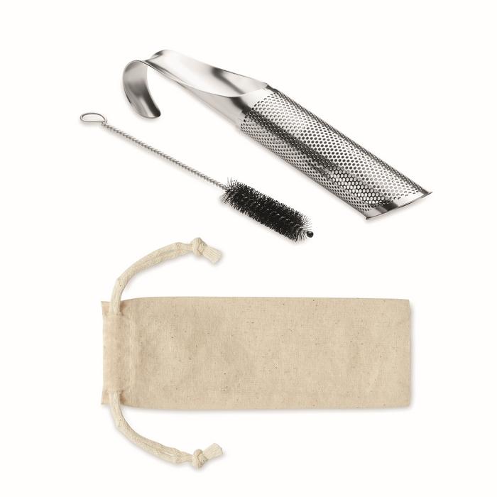 Infuseur à thé réutilisable en acier inoxydable dans une pochette en coton. Comprend un filtre à thé avec un crochet compact et incurvé pour lui permettre de reposer sur le bord de la tasse ou du mug et une brosse de nettoyage.