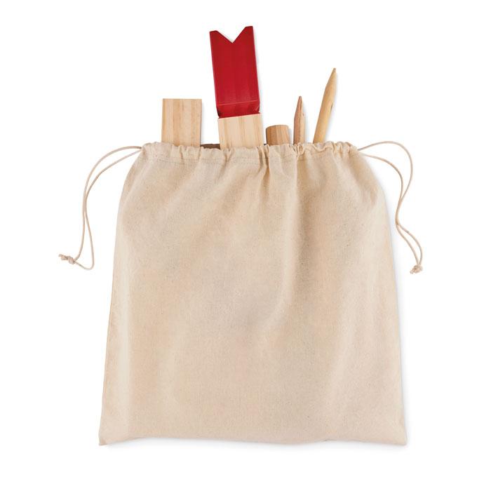 Jeu de lancer en bois de pin dans un sac en coton à cordon. Comprend 10 bâtons carrés courts, 4 bâtons pointus, 6 bâtons ronds et 1 bâton de roi.