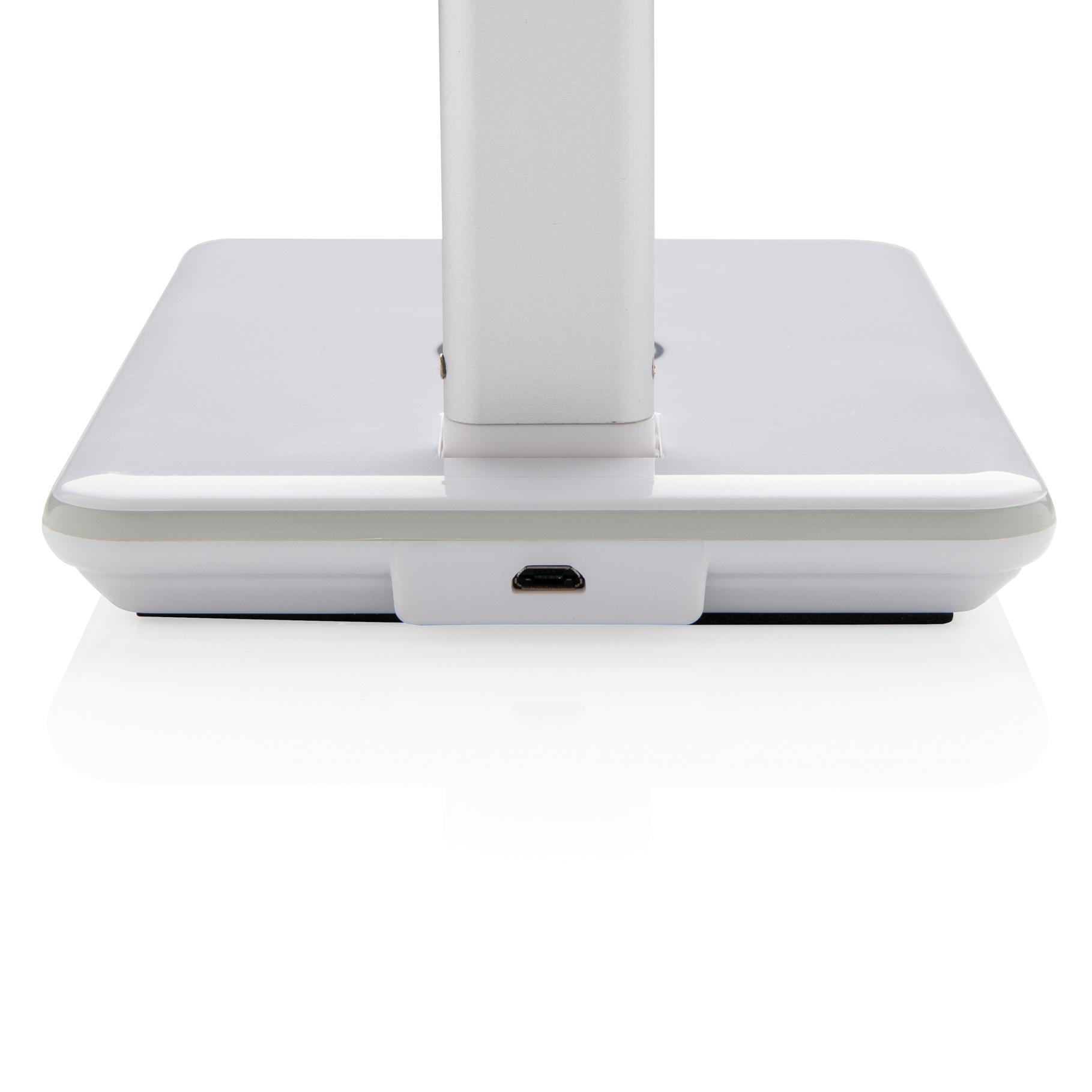 Lampe en ABS avec chargeur 5W intégrée. Pour charger votre téléphone posez-le simplement sur le socle de la lampe. Le chargement de la lampe se fait simplement avec un câble USB. L'activation de la lampe se fait par la touche tactile. Temps d'utilisation de la lampe 50.000 heures. Câble micro USB de 150 cm inclus. Chargement sans fil compatible avec tous les appareils supportant la recharge à induction (Qi) comme Android dernière génération, iPhone 8 et plus. Entrée : 5V/2A, Sortie induction : 5V/1A 5W.