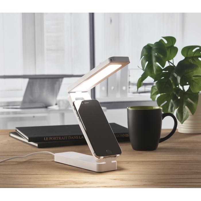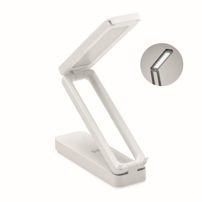 Lampe de bureau pliable en ABS avec 14 LED et 3 réglages de luminosité, chargeur sans fil 10W. Sortie : DC 9V/1.1A (10W) pour une charge rapide. Compatible derniers Androïdes, iPhone® 8 et plus récents.