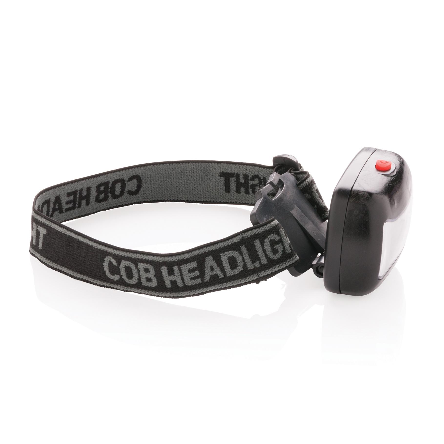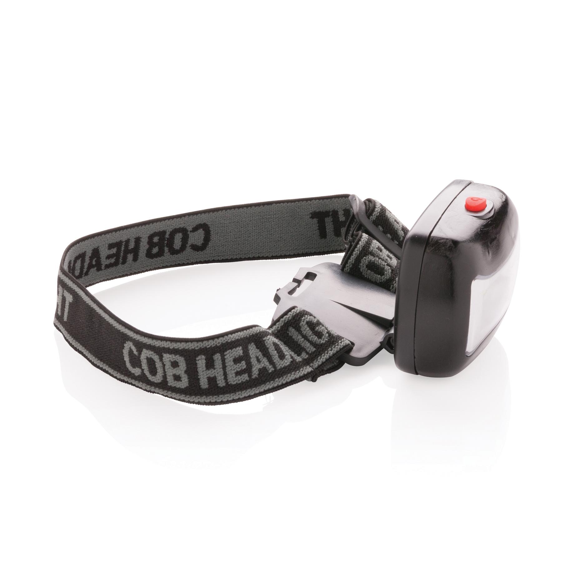 Lampe frontale en ABS avec LED de type COB (Chips On Board) ultra lumineuse. Bandeau ajustable et piles incluses.