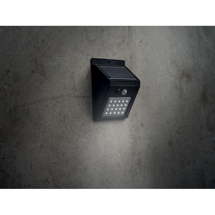 Lampe solaire 20 LED en PP avec capteurs de mouvement et de nuit. Capteur de mouvement PIR (Passive Infrared Sensor). Capteur de nuit CDS. Indice de protection : IP 44. Capacité de la batterie : 800 mAh.