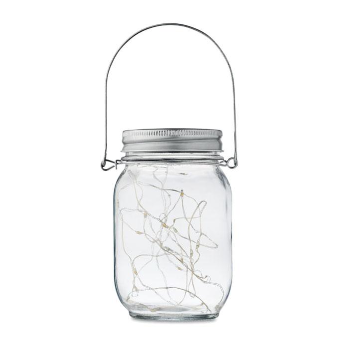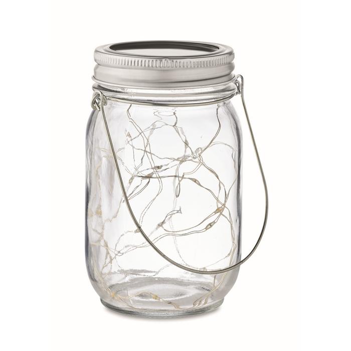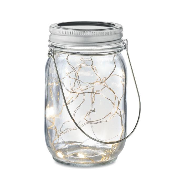 Lampe solaire d'extérieur en forme de pot avec guirlande lumineuse à 20 LED. Suspension sur le dessus. Durée de fonctionnement d'environ 5 heures. Batterie 300 mAh NI-MH incluse. IP44.