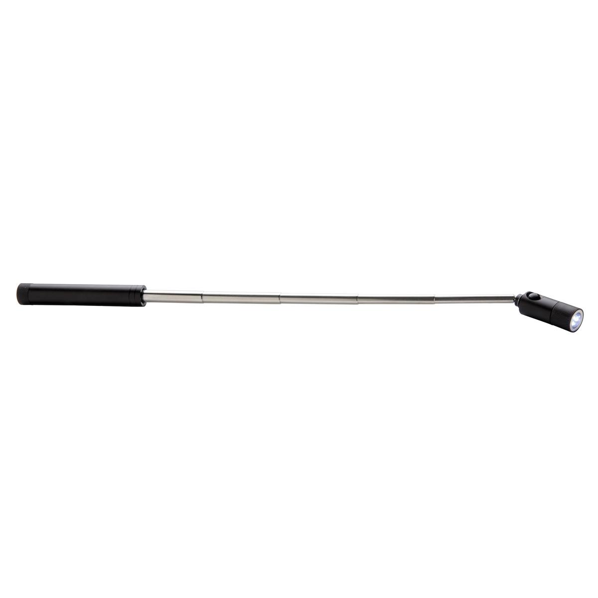 Lampe de travail magnétique avec trois LED qui peut être fixée sur n’importe quelle surface métallique pour un éclairage optimal. Cette lampe torche en aluminium vous permet de la faire passer de sa taille normale de 17 cm à 58 cm, pour atteindre des endroits difficiles. Lorsque la lampe est rallongée, la tête pivote et peut être réglée dans n’importe quelle direction. Piles incluses.