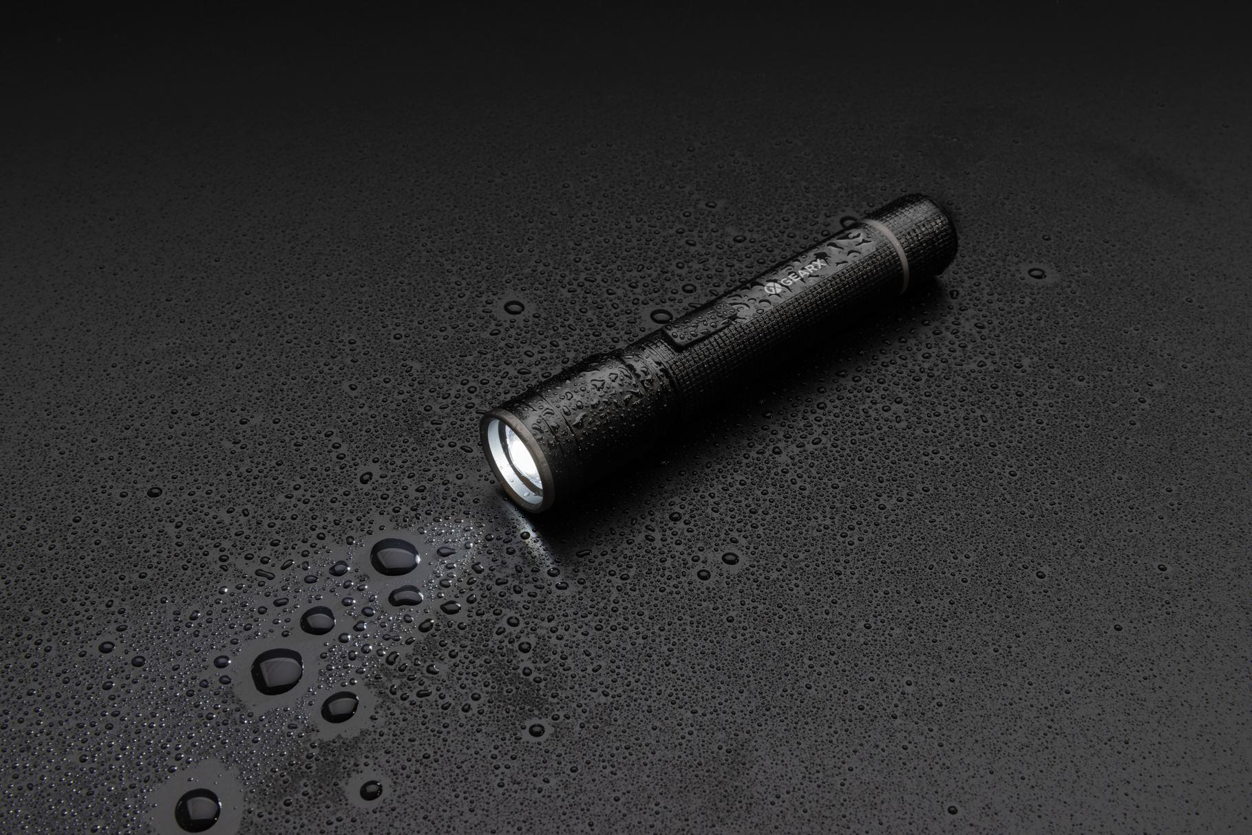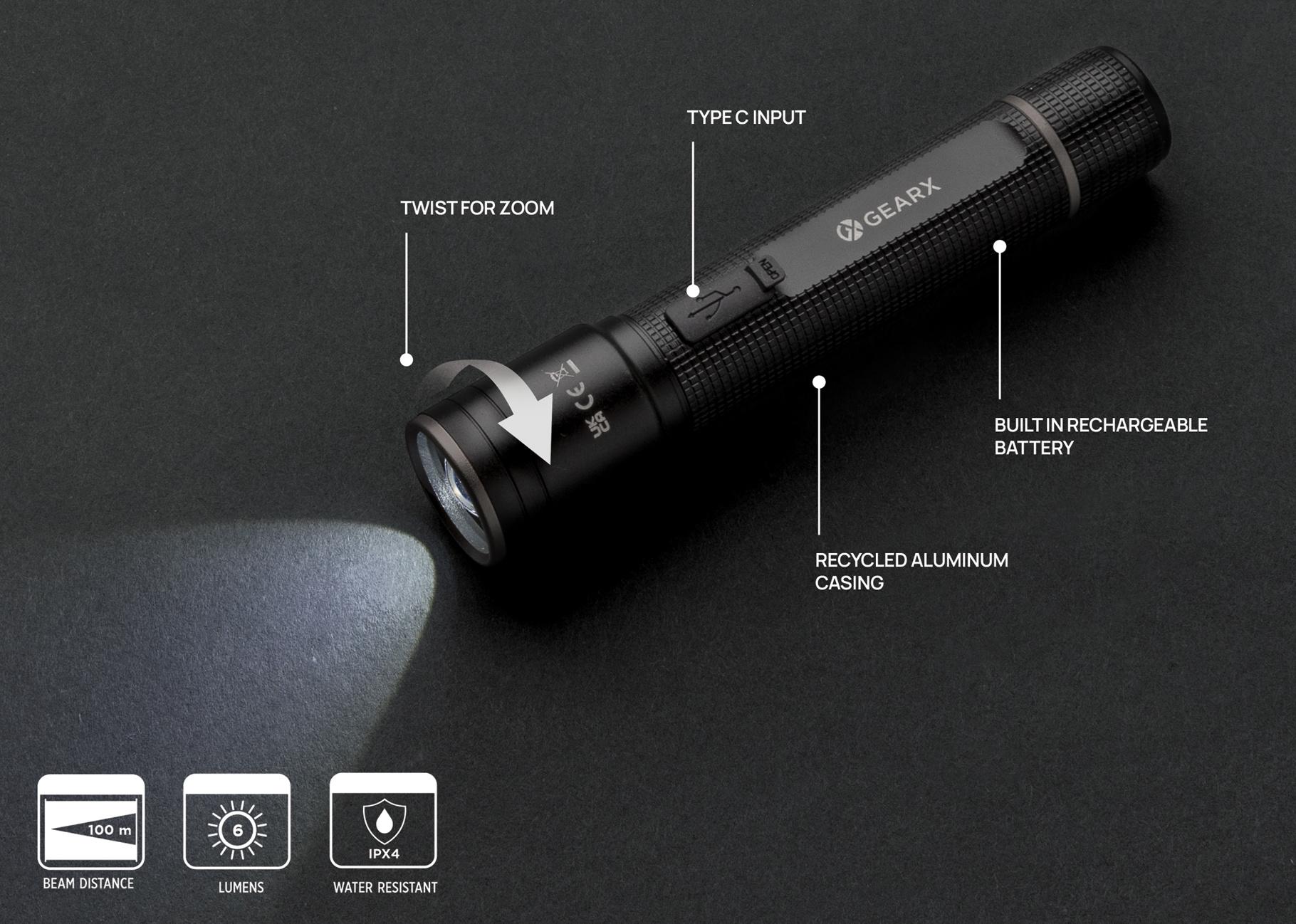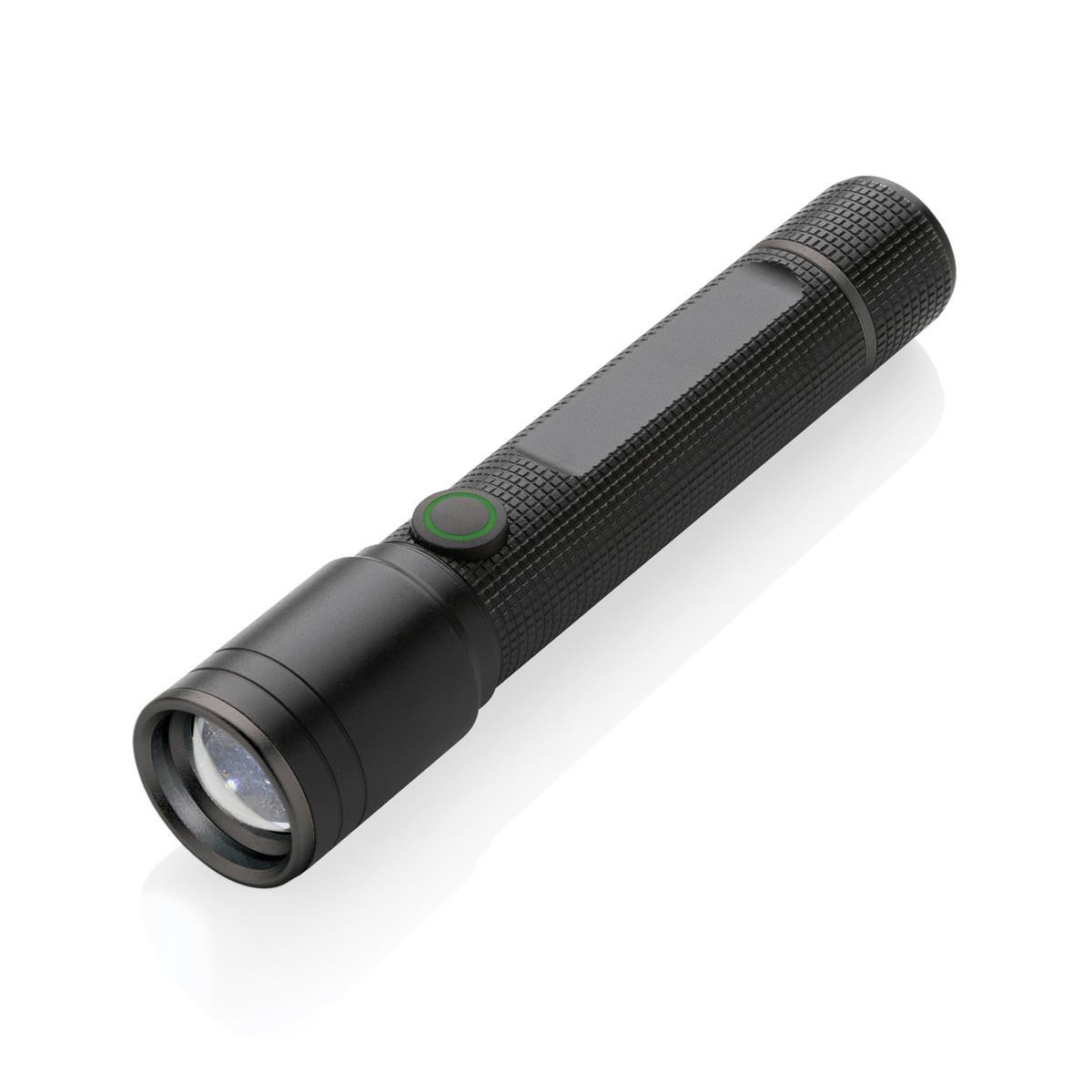 Torche rechargeable 3W fabriquée avec de l'aluminium recyclé certifié RCS. Contenu recyclé total : 20 % sur la base du poids total de l'article. La certification RCS garantit une chaîne d'approvisionnement entièrement certifiée pour les matériaux recyclés. Grâce à son indice de protection IPX4, elle résiste aux intempéries et peut donc être utilisée à l'extérieur. L'ampoule puissante produit jusqu'à 100 lumens et un faisceau qui atteint jusqu'à 100 mètres. Il suffit de la recharger via une prise USB et le câble de type C recyclé certifié RCS inclus. L'ampoule de qualité est dotée de 5 modes, dont la fonction SOS. La batterie de 500 mAh permet une utilisation jusqu'à 4 heures sur une seule charge et permet également de charger vos téléphones via le type C. L'aluminium ne perd pas ses caractéristiques dans le processus de recyclage et peut être recyclé à l'infini. L'article et les accessoires sont 100 % sans PVC. Emballé dans un emballage FSC mix. Entrée Type-C 5V, 1A ; Sortie 5V.