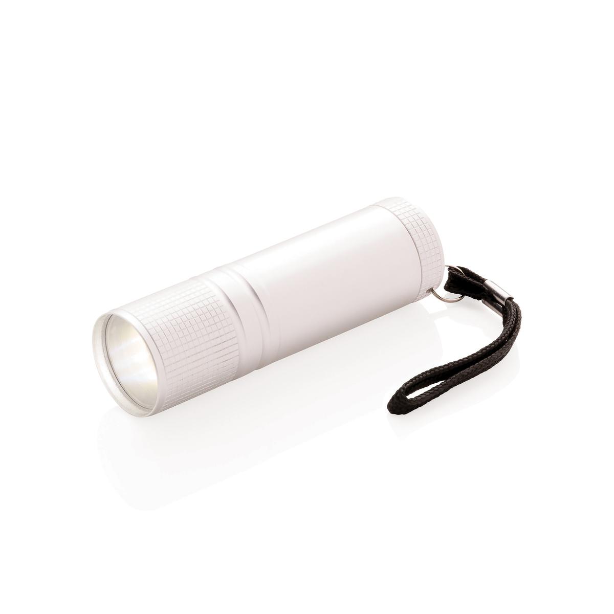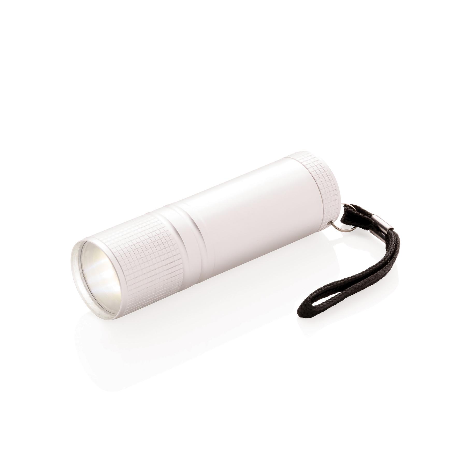 Lampe torche COB en aluminium, super puissante en taille de poche. Cette lampe COB est beaucoup plus puissante que les lampes LED habituelles et consomme moins d’énergie, permettant une autonomie 30% plus importante sur la même batterie. Avec dragonne et 3 piles AAA incluses.