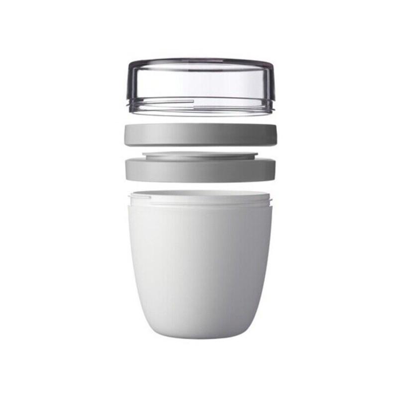 Le pot à yaourt est 100 % étanche et passe au congélateur, micro-ondes et lave-vaisselle. Le compartiment haut a une capacité de 200 ml, il peut contenir environ 75 grammes de muesli ou de morceaux de fruits. La capacité du compartiment bas est de 500 ml, largement assez pour une bonne quantité de soupe, de nouilles ou de yaourt. La boîte à déjeuner est faite en un matériau durable et convient pour une utilisation au congélateur, au micro-ondes (n’oubliez pas d’enlever le couvercle) et au lave-vaisselle. Le conteneur transparent du haut ne passe pas au four à micro-ondes.