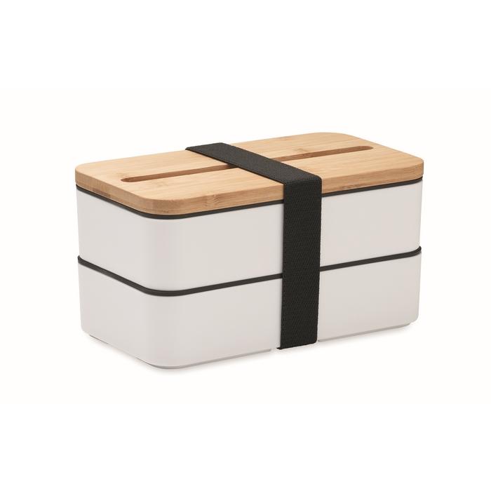 Lunchbox à deux niveaux en PP recyclé avec séparateur amovible et 3 couverts. Bande de fermeture en polyester et couvercle en bambou doté d'un support pour téléphone portable. Capacité : 400 ml (2x). Le bambou est un produit naturel, et présente de légères variations de couleur, de décoration et de tailles.