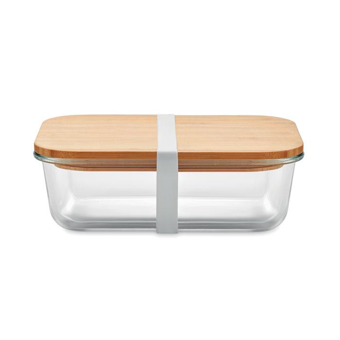 Lunchbox en verre avec couvercle en bambou et bande en silicone. Contenance 800 ml. Le bambou est un produit naturel, il peut y avoir de légères variations de couleur et de taille par article.
