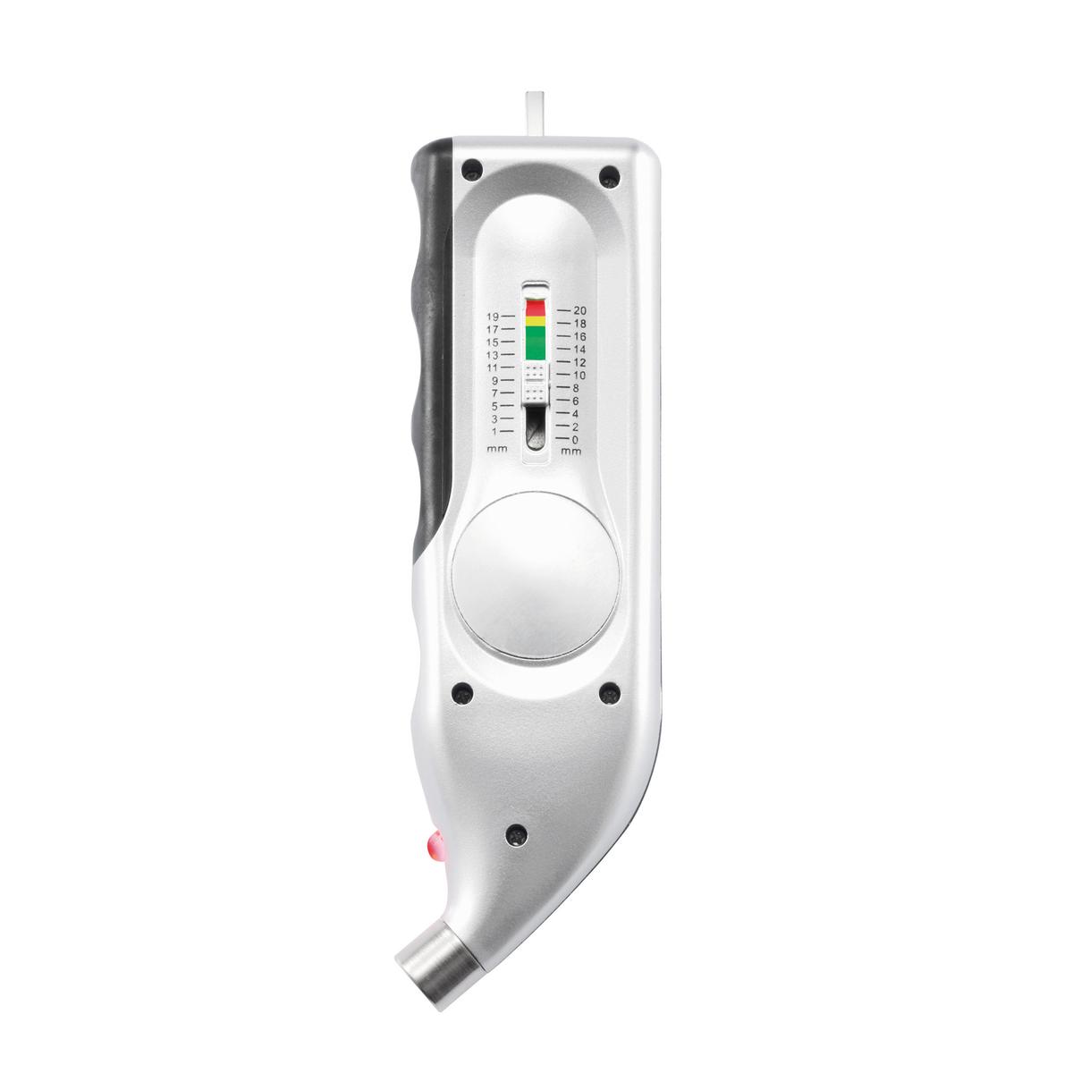 Manomètre digital avec indicateur de profondeur du pneu. Corps en ABS argenté, poignée noire, 1 LED rouge. Echelle 5-100 PSI, 0,5-7 bar, 50-700 Kpa.