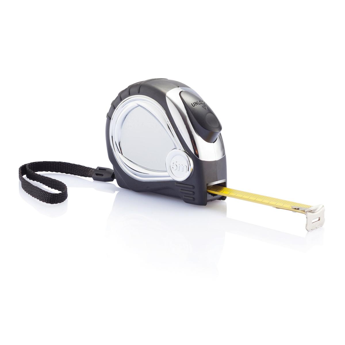 Mètre 5m/19mm avec boîtier en ABS finition chromée et caoutchouc. Ruban jaune, clip ceinture et dragonne.
